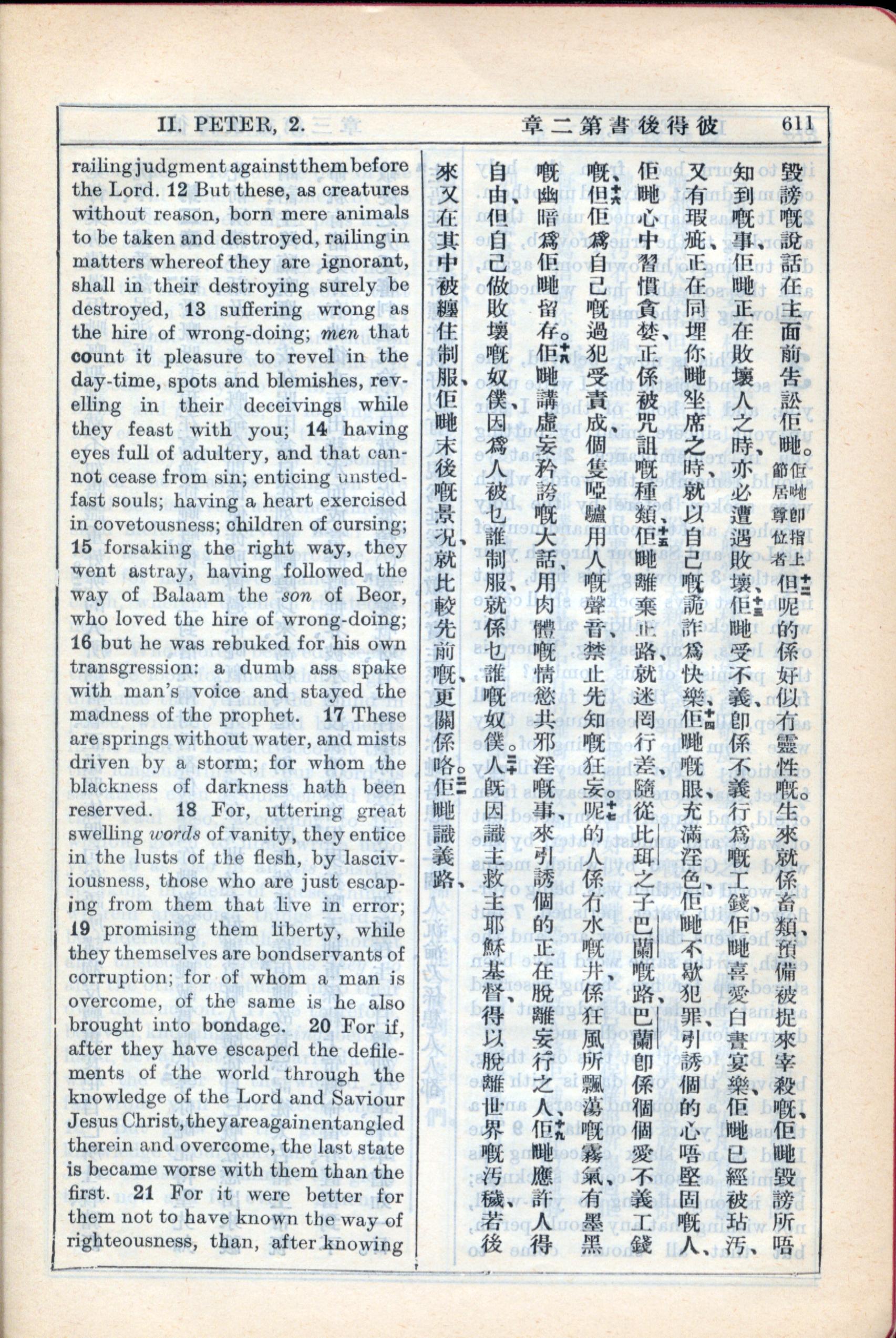 1931年新約全書廣東話新譯本與美國新譯英文 彼得後書 2 章 12 節到 2 章 21 節