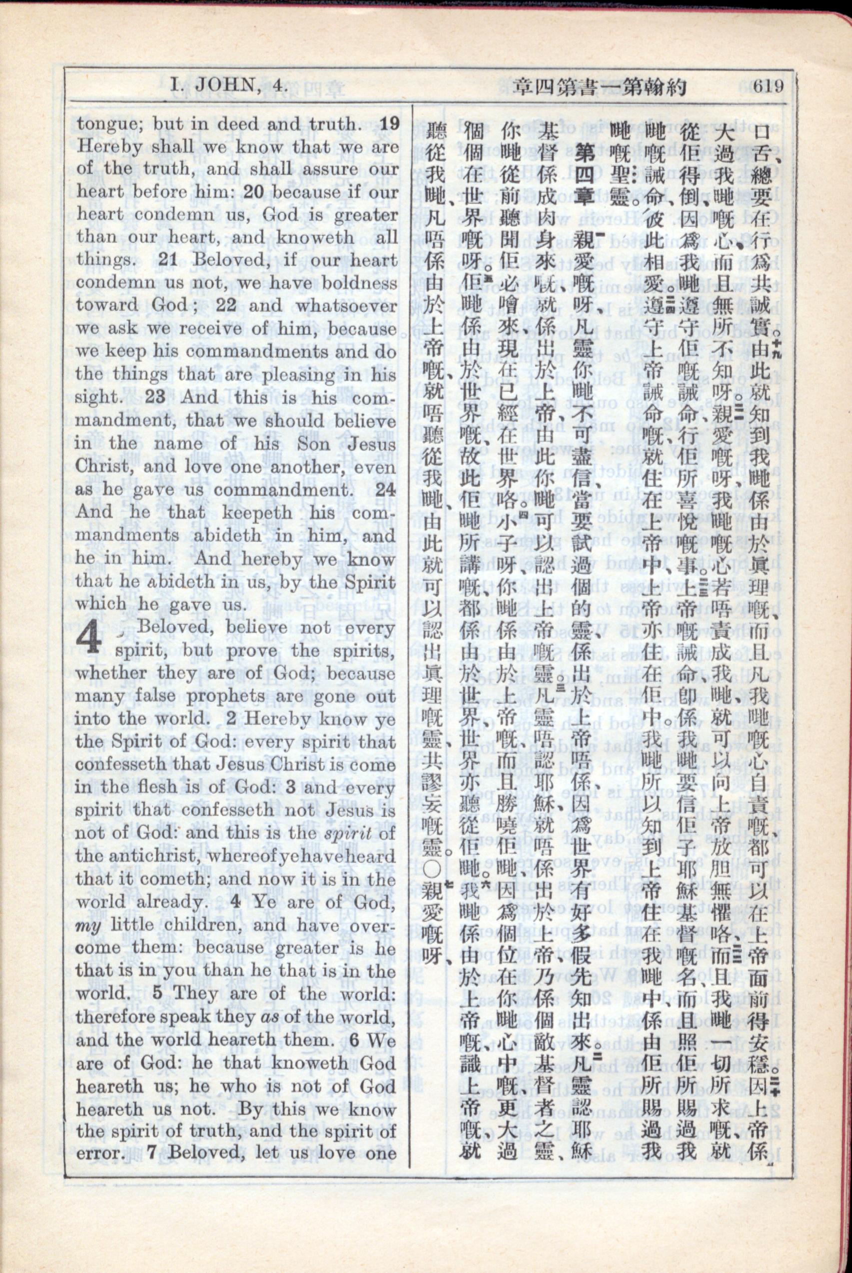 1931年新約全書廣東話新譯本與美國新譯英文 約翰一書 3 章 19 節到 4 章 7 節
