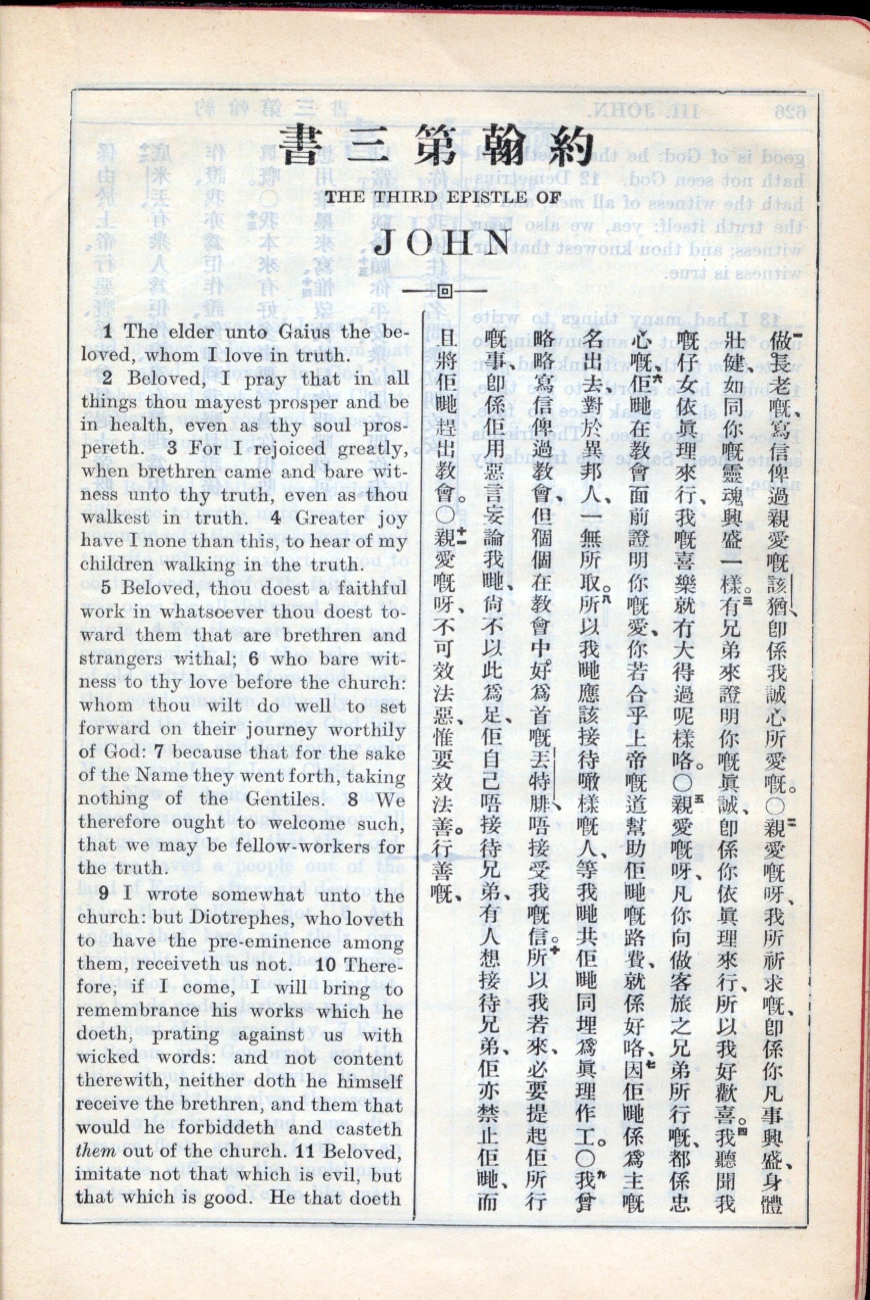 1931年新約全書廣東話新譯本與美國新譯英文 約翰三書 1 章 1 節到 1 章 11 節