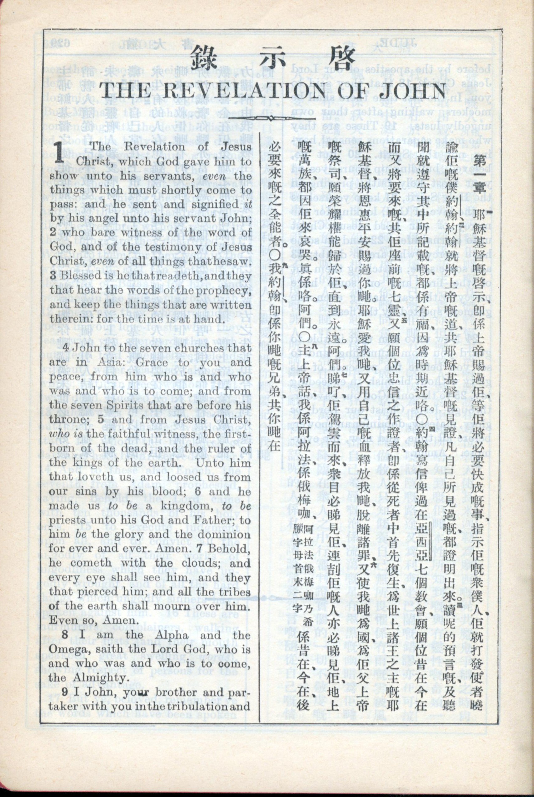 1931年新約全書廣東話新譯本與美國新譯英文 啟示錄 1 章 1 節到 1 章 9 節