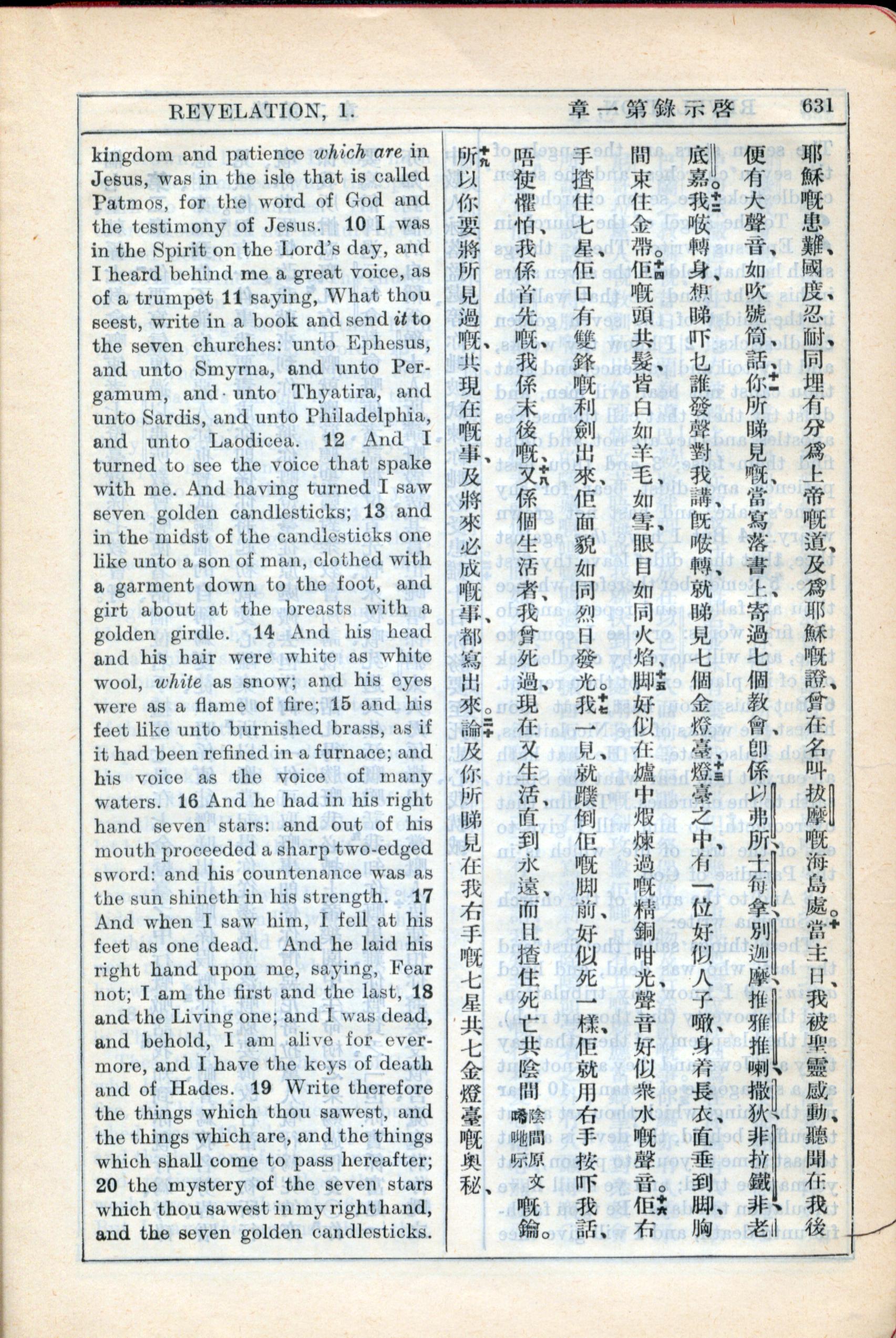 1931年新約全書廣東話新譯本與美國新譯英文 啟示錄 1 章 10 節到 1 章 20 節