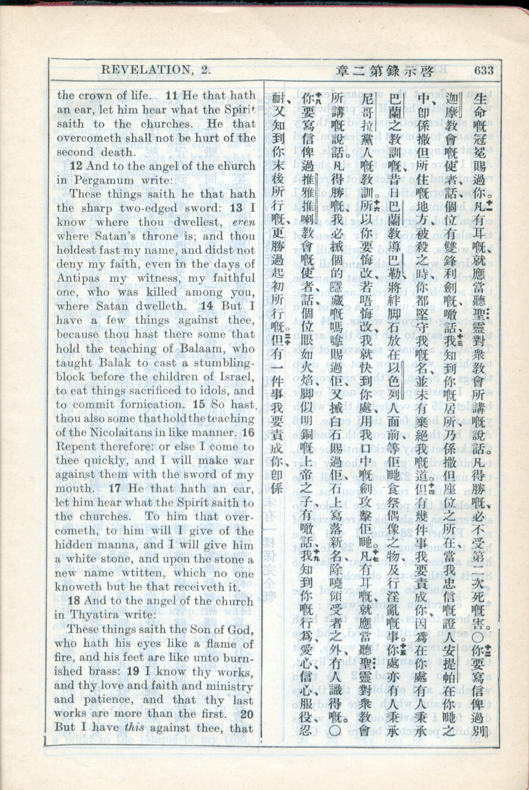1931年新約全書廣東話新譯本與美國新譯英文 啟示錄 2 章 11 節到 2 章 19 節