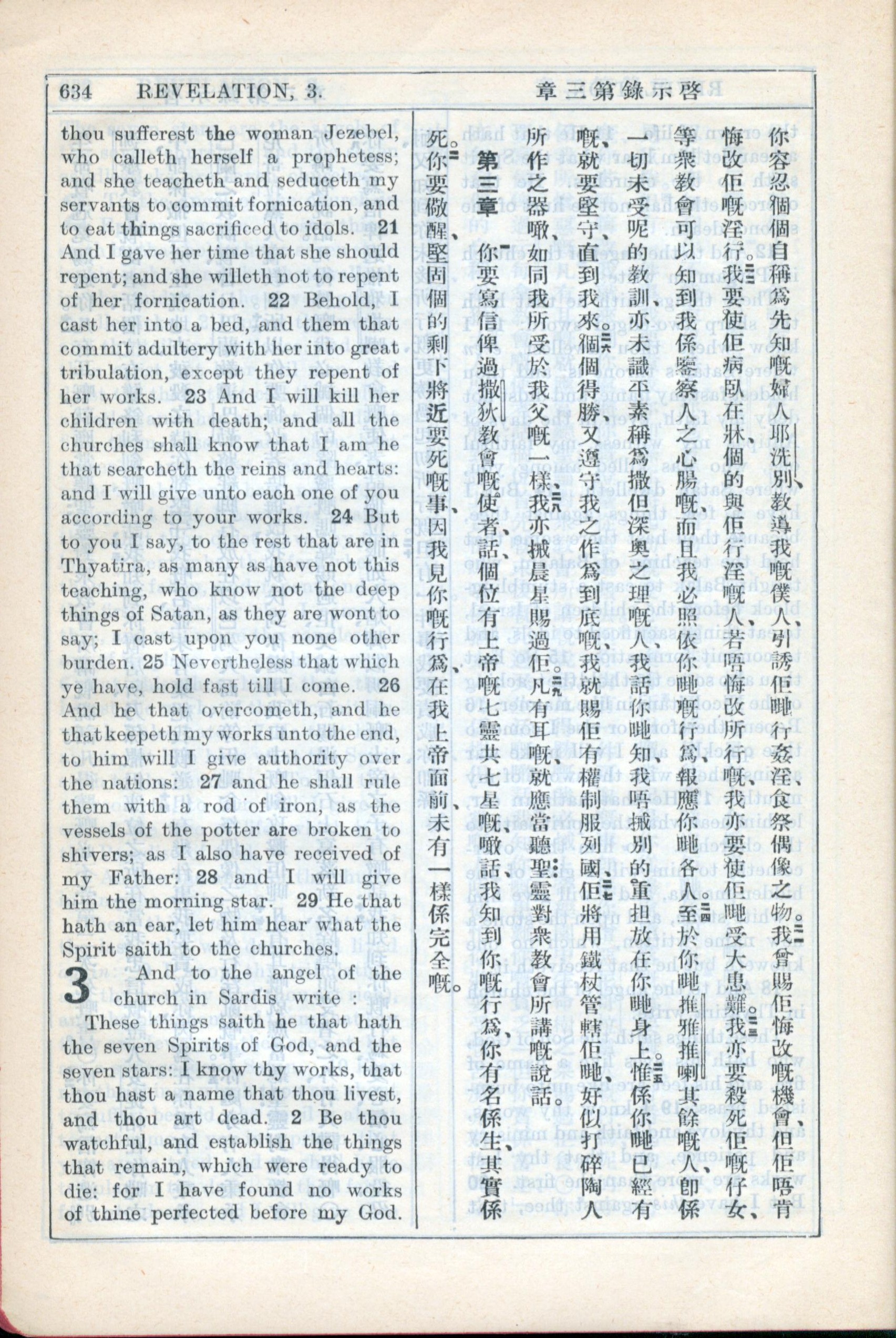 1931年新約全書廣東話新譯本與美國新譯英文 啟示錄 2 章 20 節到 3 章 2 節