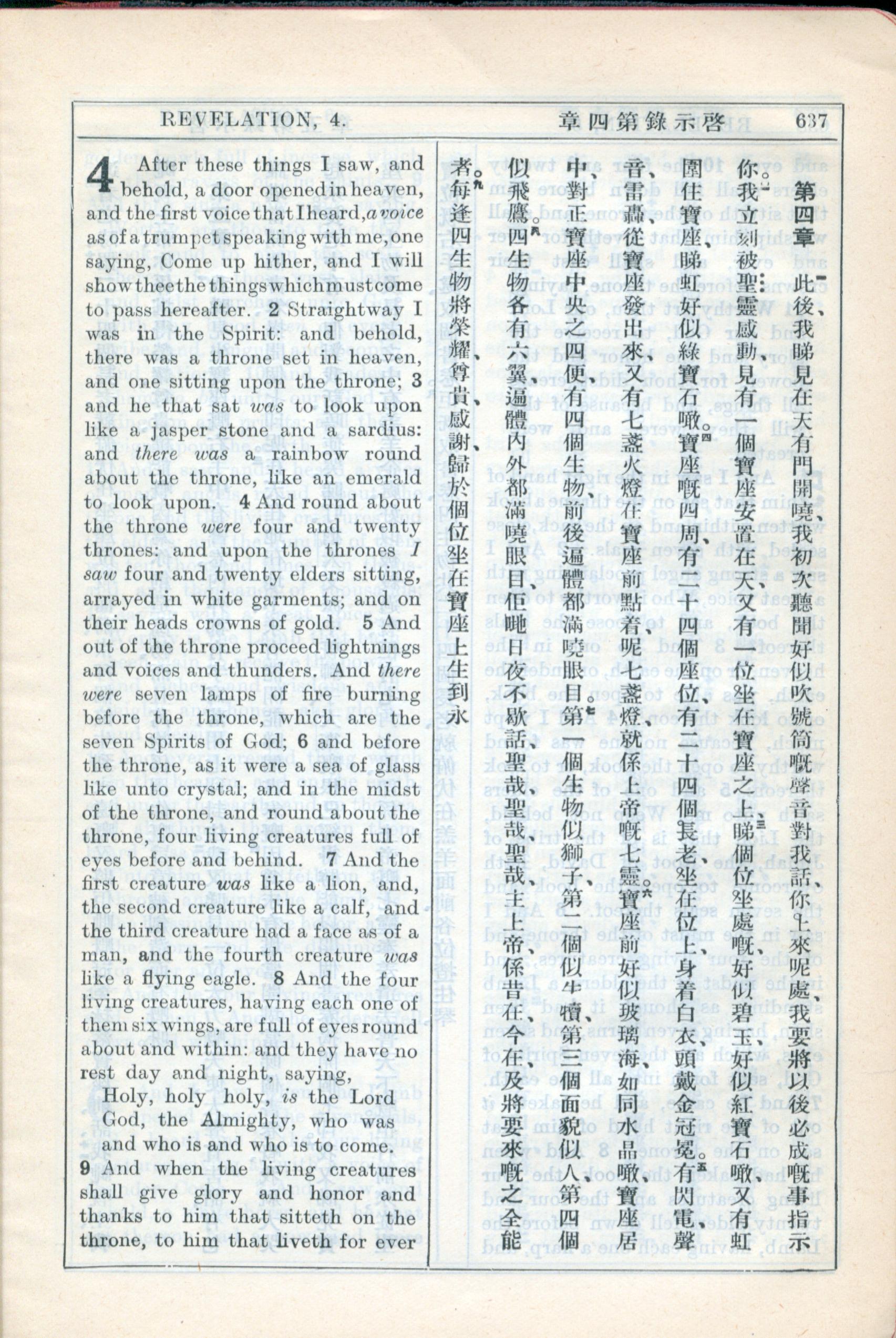 1931年新約全書廣東話新譯本與美國新譯英文 啟示錄 4 章 1 節到 4 章 9 節