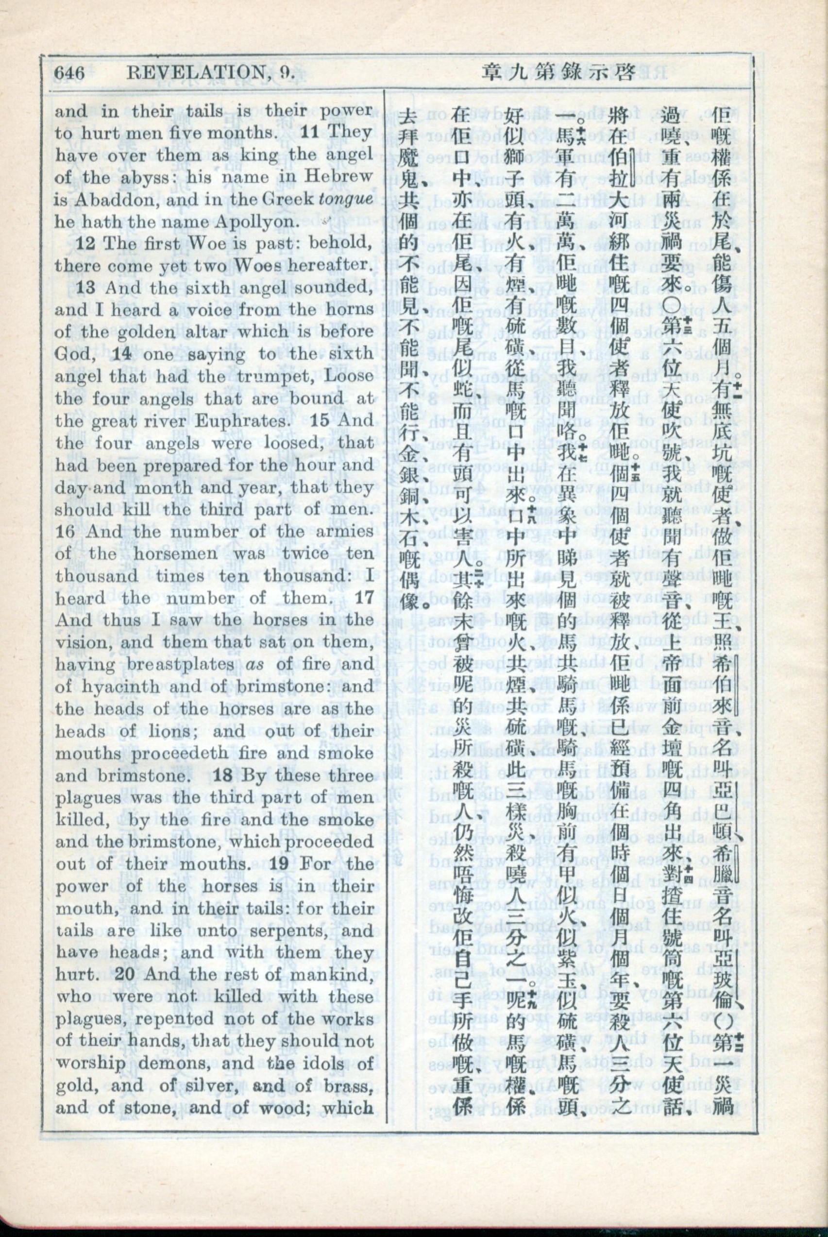 1931年新約全書廣東話新譯本與美國新譯英文 啟示錄 9 章 11 節到 9 章 20 節