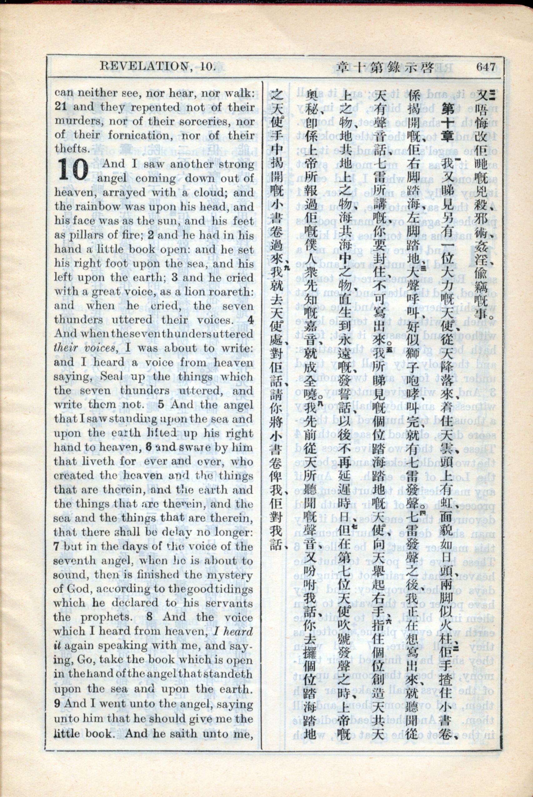 1931年新約全書廣東話新譯本與美國新譯英文 啟示錄 9 章 21 節到 10 章 9 節