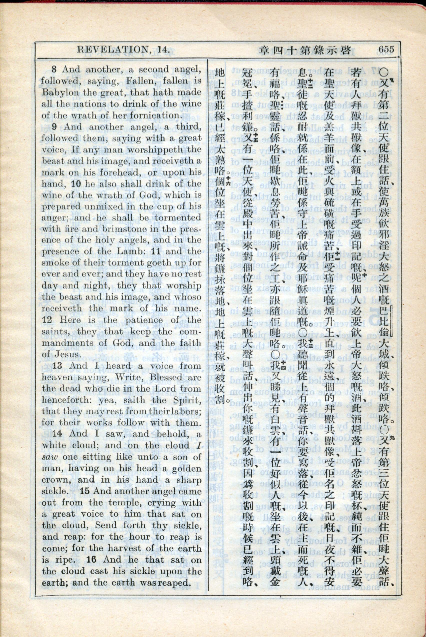 1931年新約全書廣東話新譯本與美國新譯英文 啟示錄 14 章 8 節到 14 章 16 節
