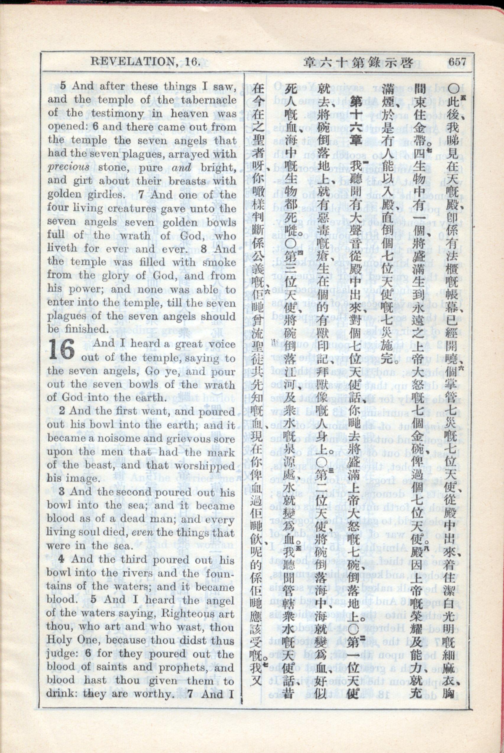 1931年新約全書廣東話新譯本與美國新譯英文 啟示錄 15 章 5 節到 16 章 6 節
