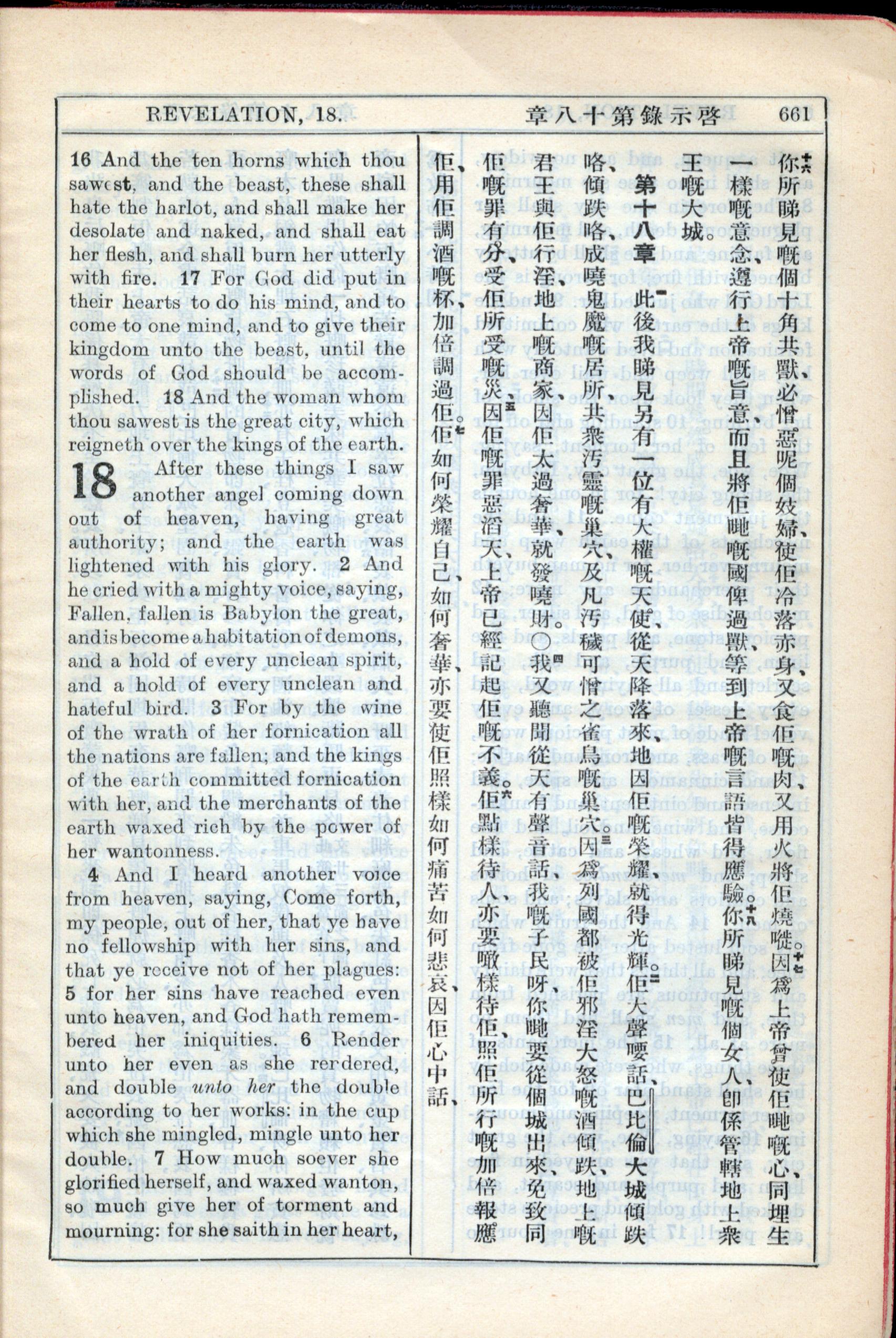 1931年新約全書廣東話新譯本與美國新譯英文 啟示錄 17 章 16 節到 18 章 7 節