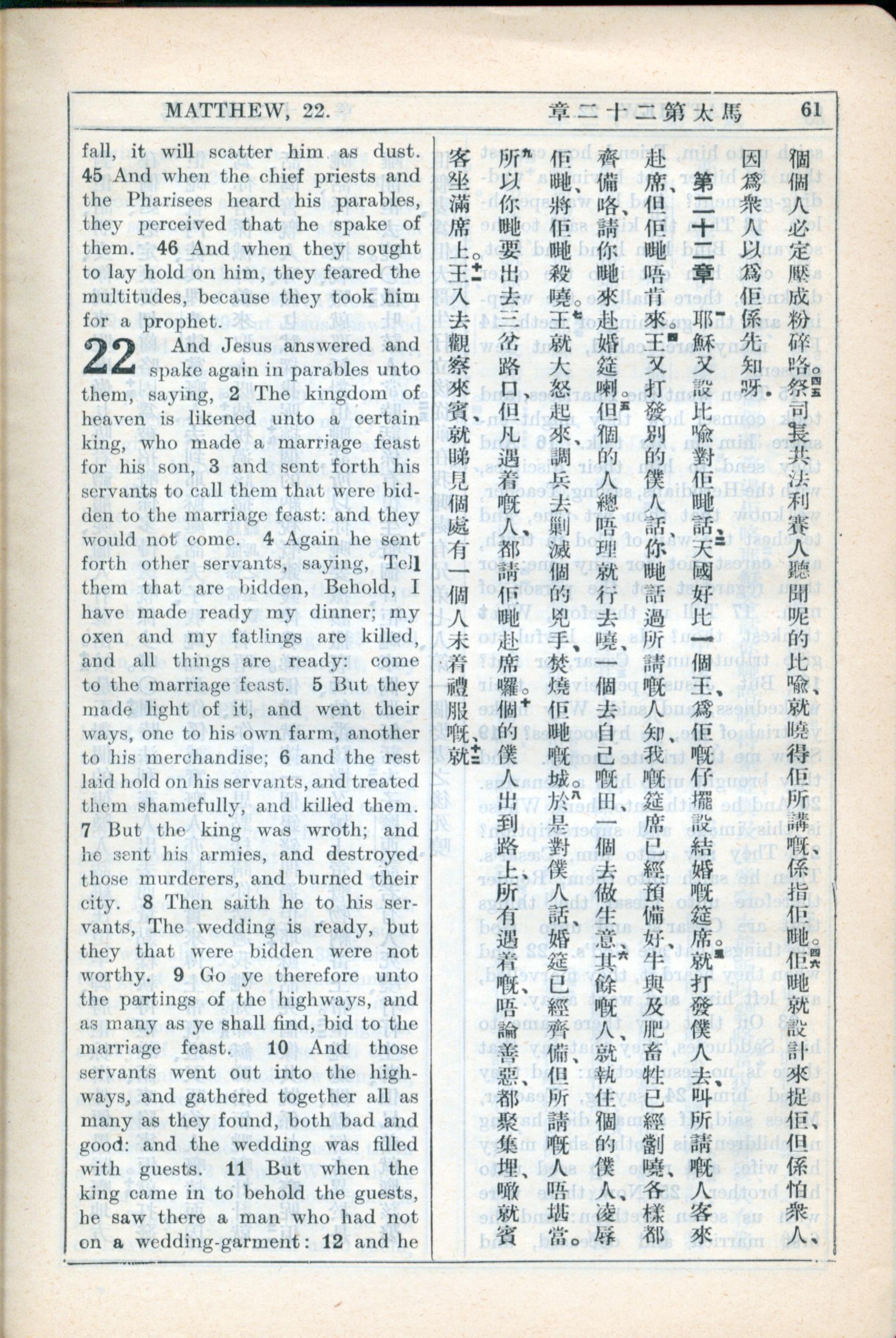 1931年新約全書廣東話新譯本與美國新譯英文 馬太福音 21 章 45 節到 22 章 11 節