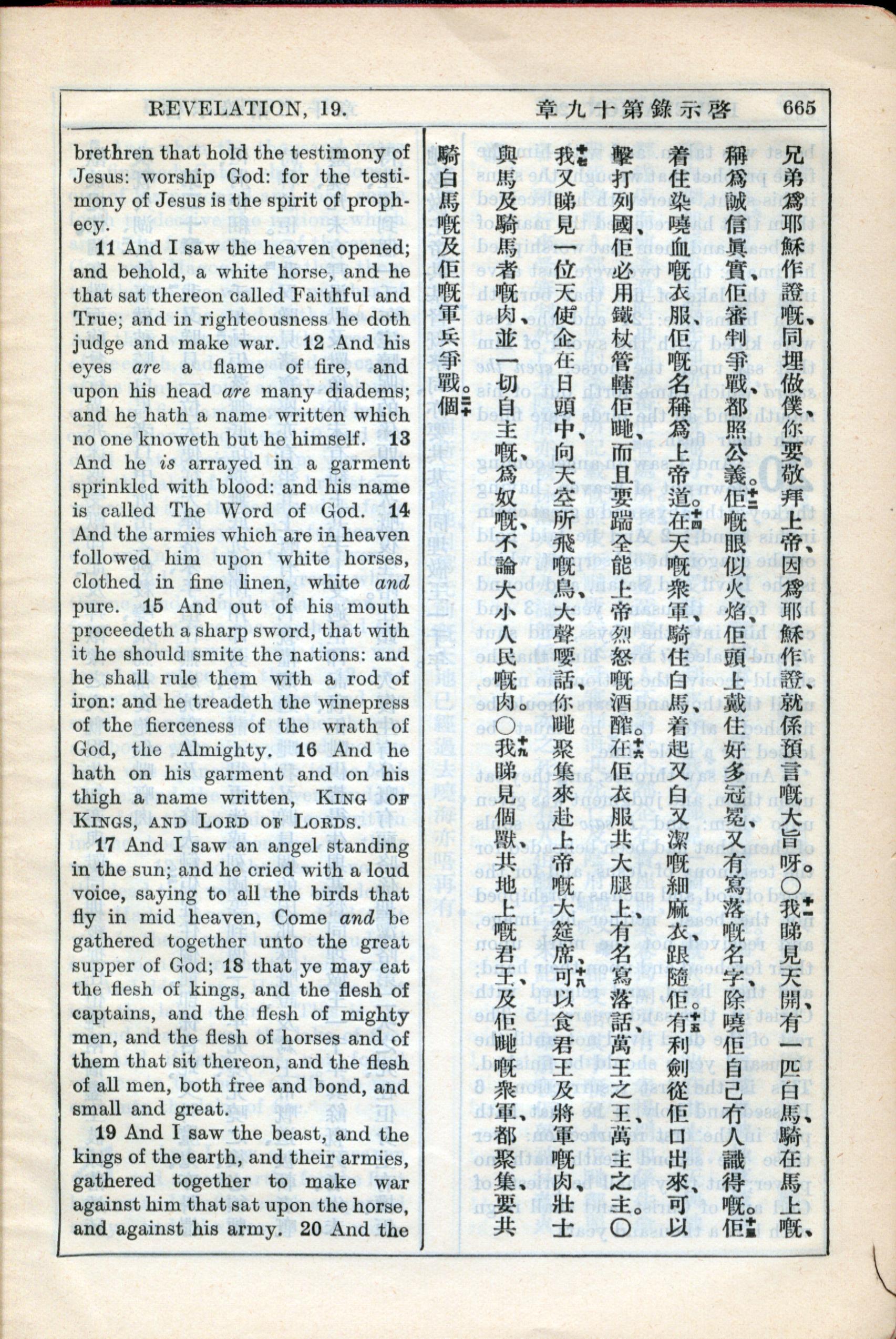 1931年新約全書廣東話新譯本與美國新譯英文 啟示錄 19 章 11 節到 19 章 19 節