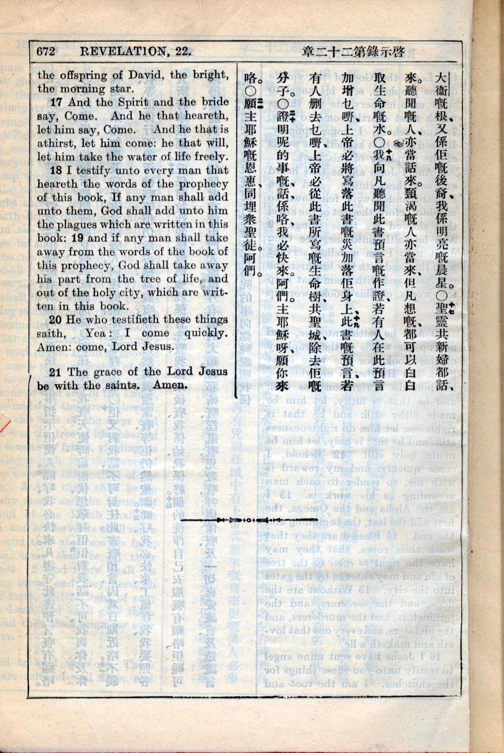 1931年新約全書廣東話新譯本與美國新譯英文 啟示錄 22 章 17 節到 22 章 21 節