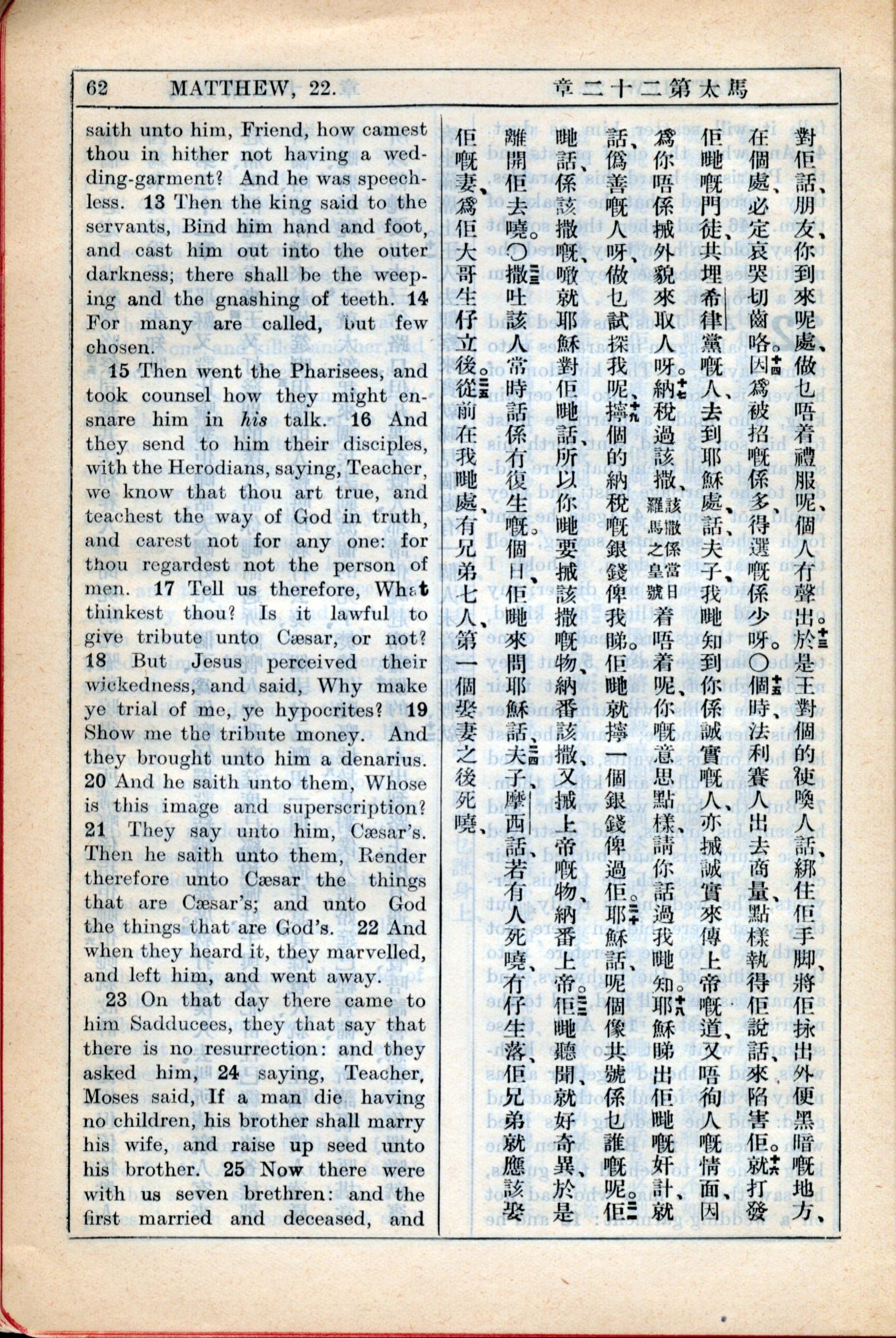 1931年新約全書廣東話新譯本與美國新譯英文 馬太福音 22 章 12 節到 22 章 25 節