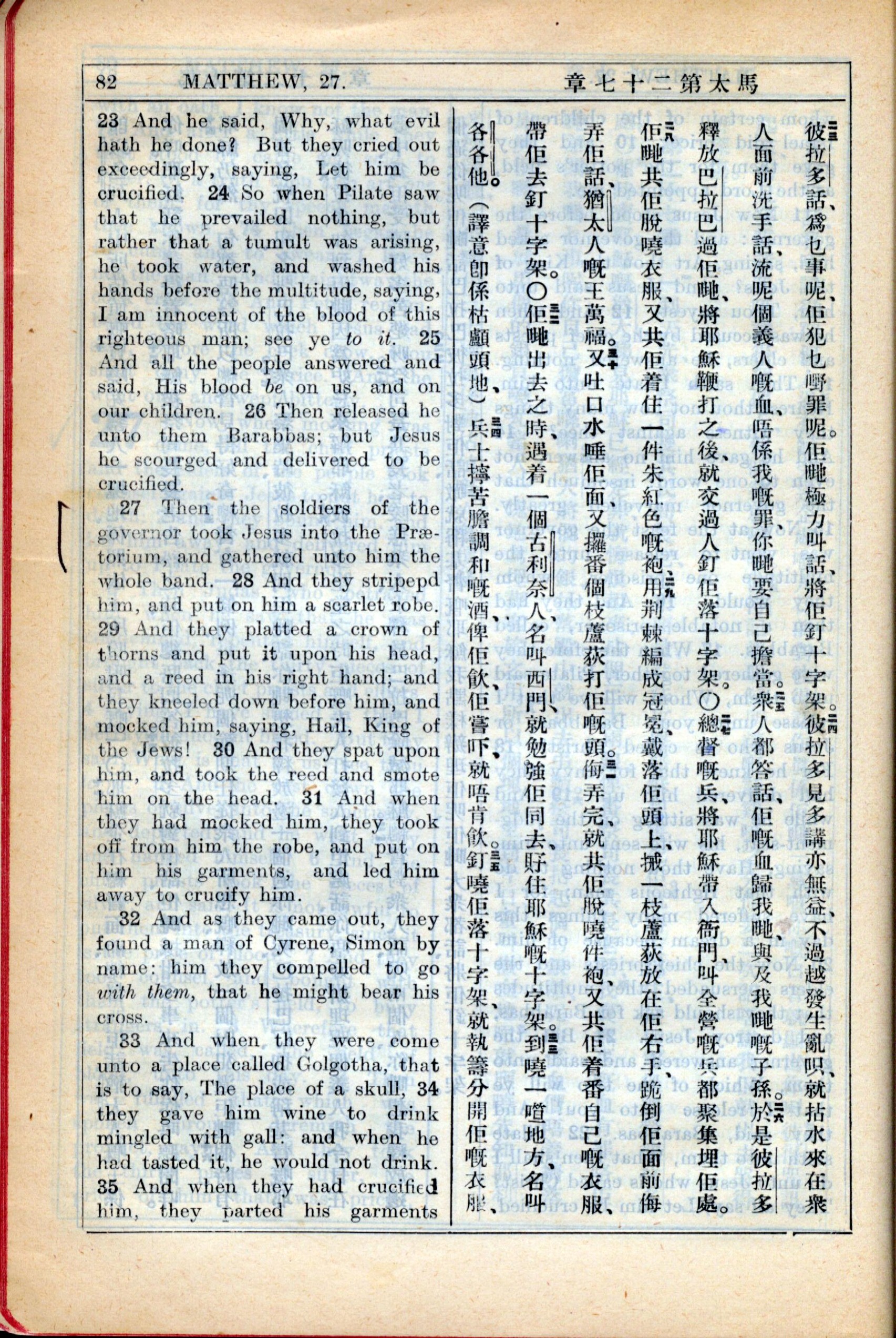 1931年新約全書廣東話新譯本與美國新譯英文 馬太福音 27 章 23 節到 27 章 35 節