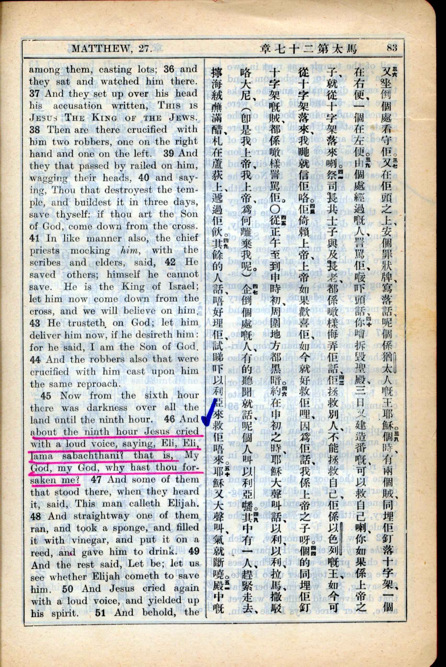 1931年新約全書廣東話新譯本與美國新譯英文 馬太福音 27 章 36 節到 27 章 50 節