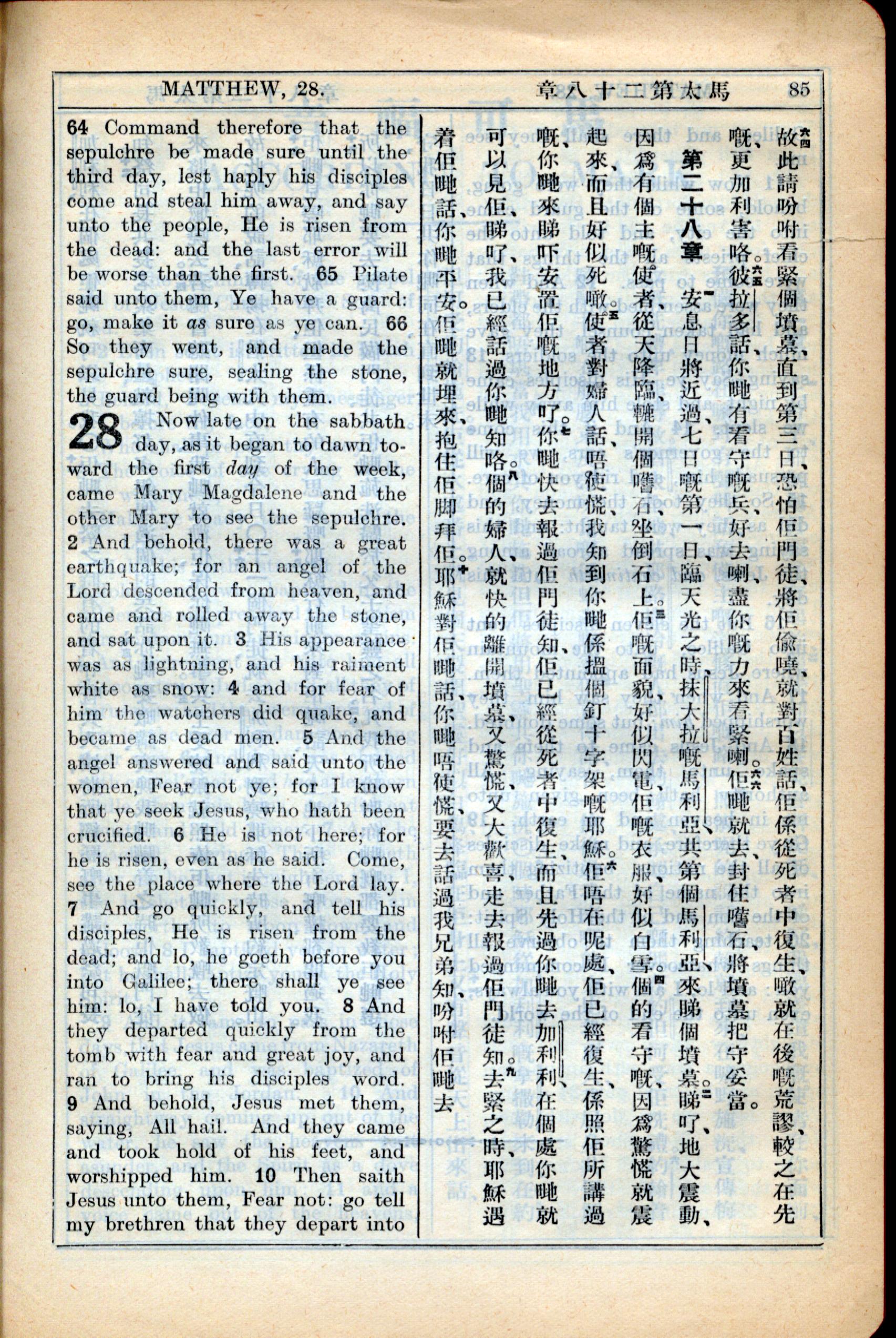 1931年新約全書廣東話新譯本與美國新譯英文 馬太福音 27 章 64 節到 28 章 10 節