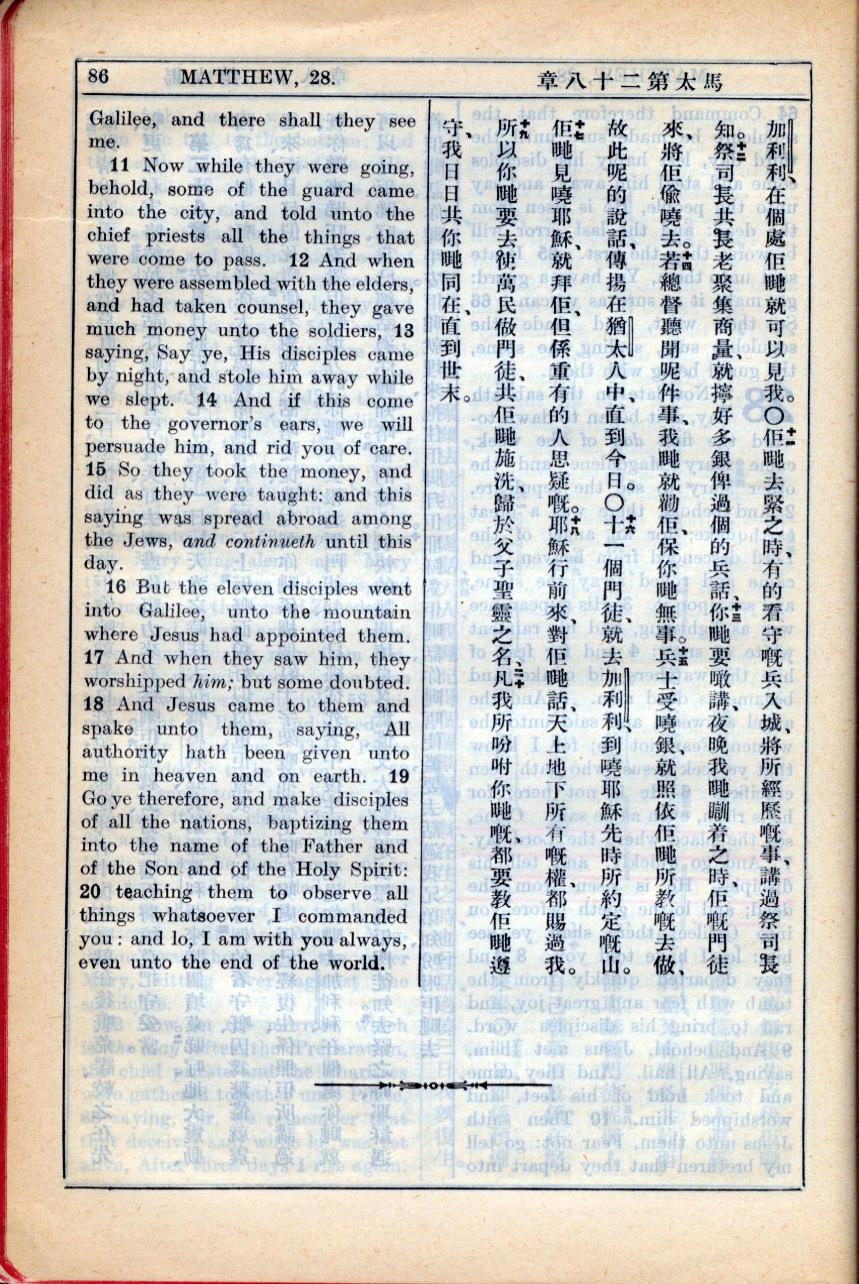 1931年新約全書廣東話新譯本與美國新譯英文 馬太福音 28 章 11 節到 28 章 20 節