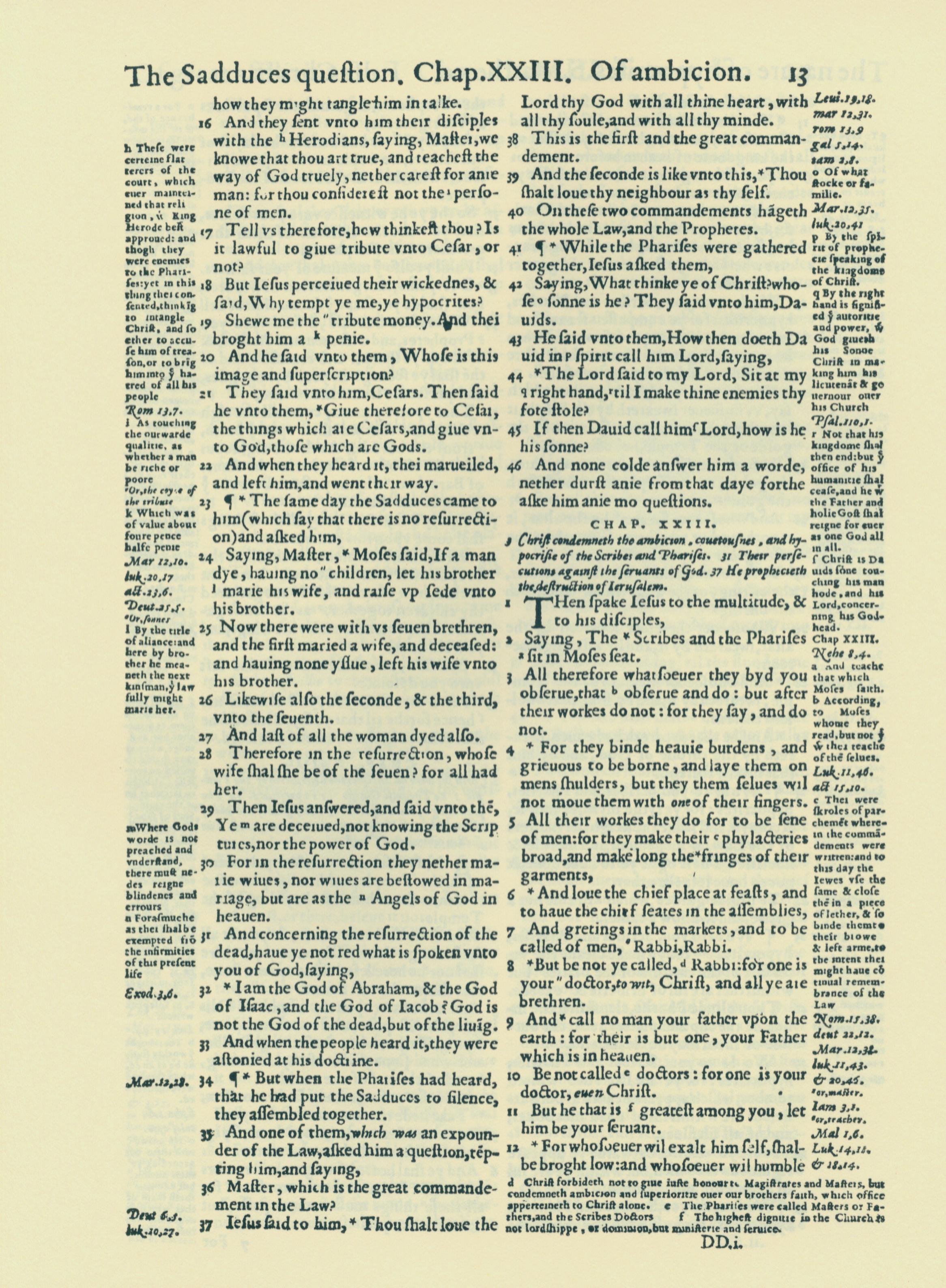 1560年THE BIBLE AND HOLY SCRIPTURES 馬太福音 22 章 16 節到 23 章 12 節