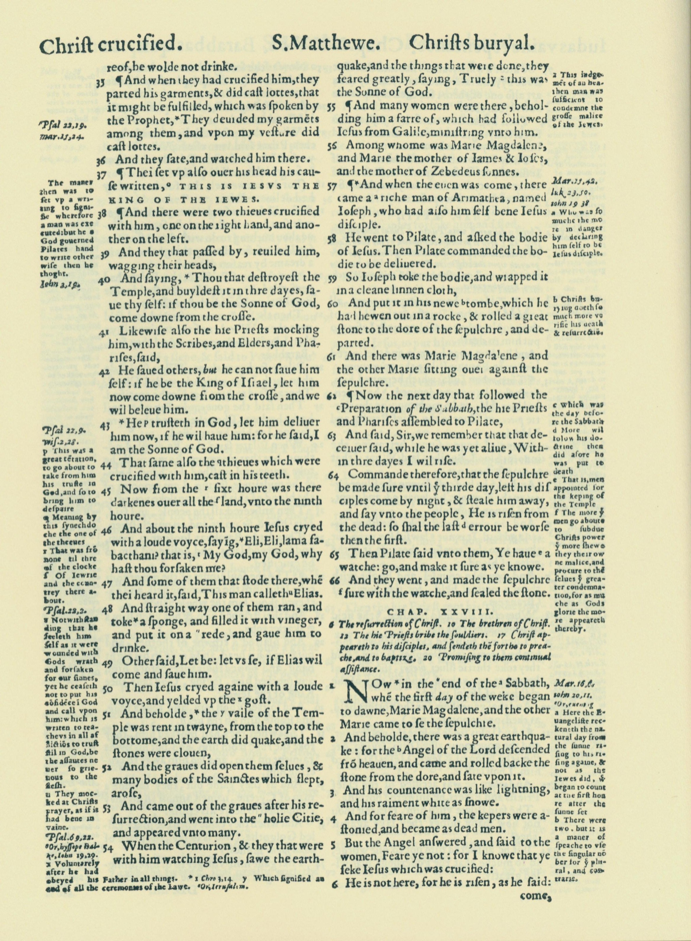 1560年THE BIBLE AND HOLY SCRIPTURES 馬太福音 27 章 35 節到 28 章 6 節