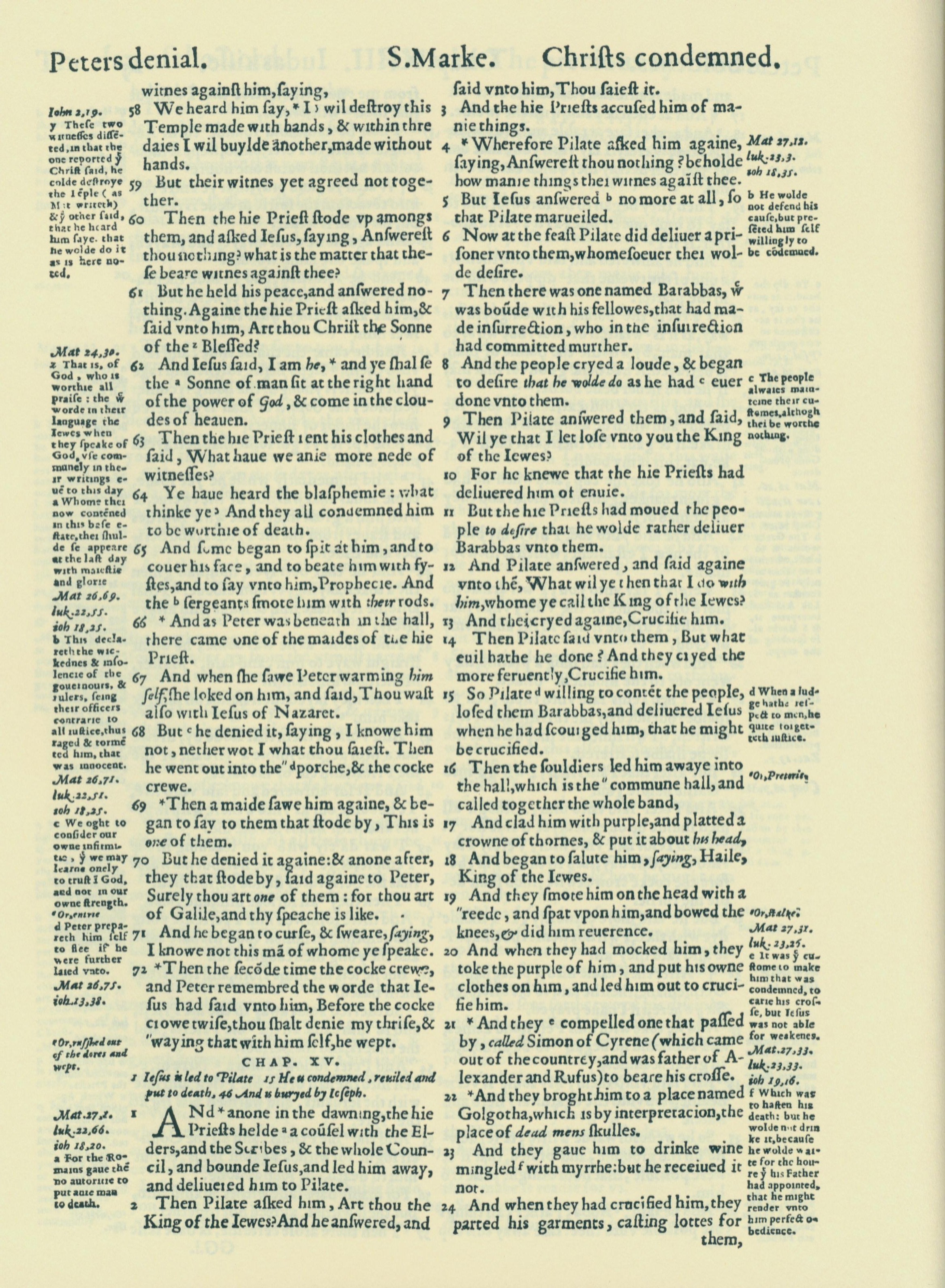 1560年THE BIBLE AND HOLY SCRIPTURES 馬可福音 14 章 58 節到 15 章 24 節