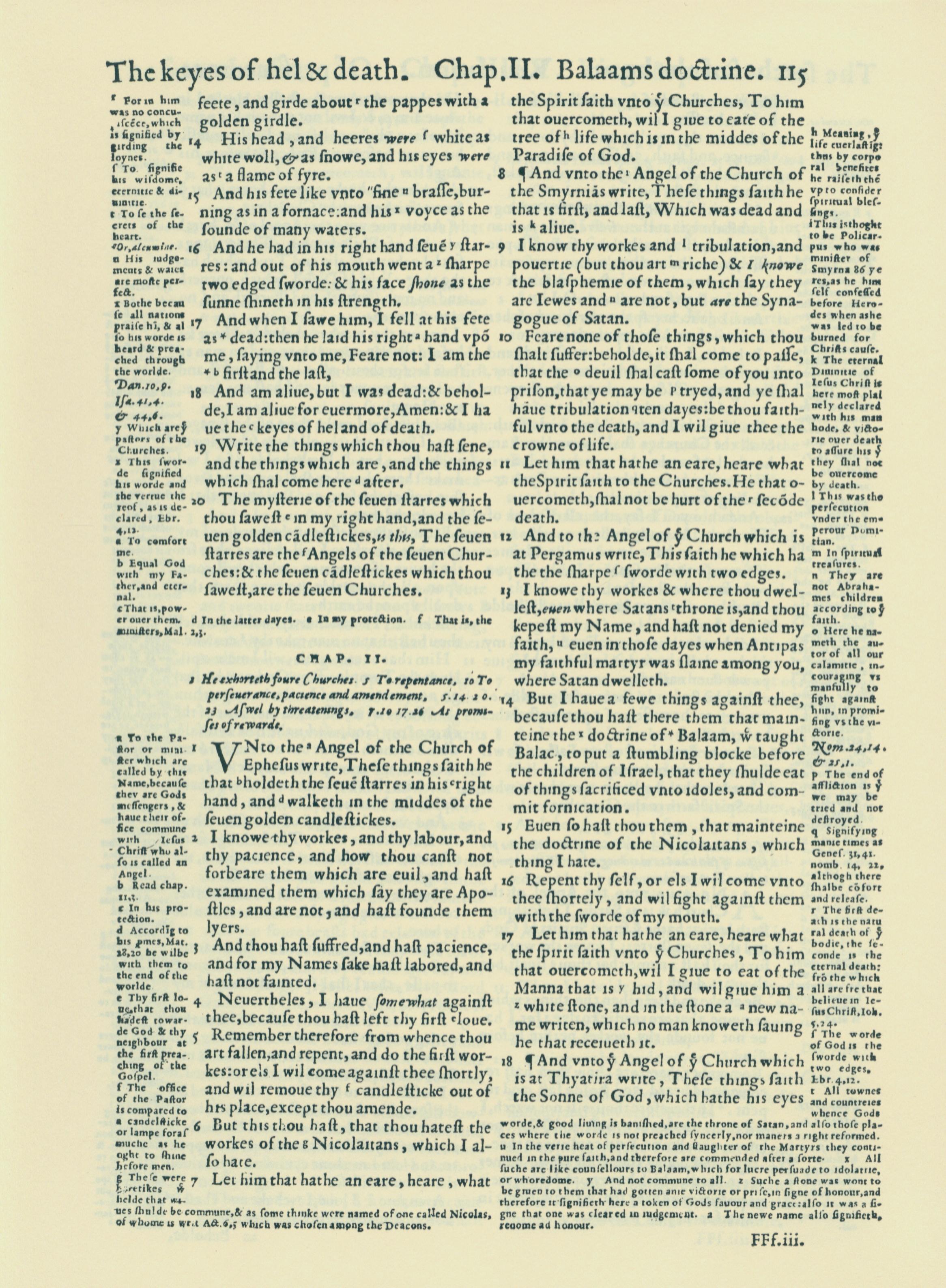 1560年THE BIBLE AND HOLY SCRIPTURES 啟示錄 1 章 14 節到 2 章 18 節