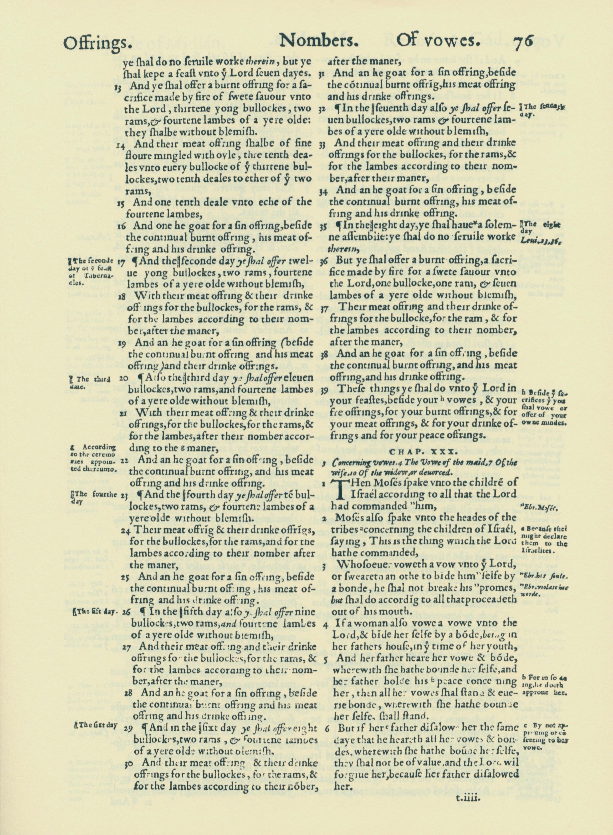 1560年THE BIBLE AND HOLY SCRIPTURES 民數記 29 章 13 節到 30 章 6 節