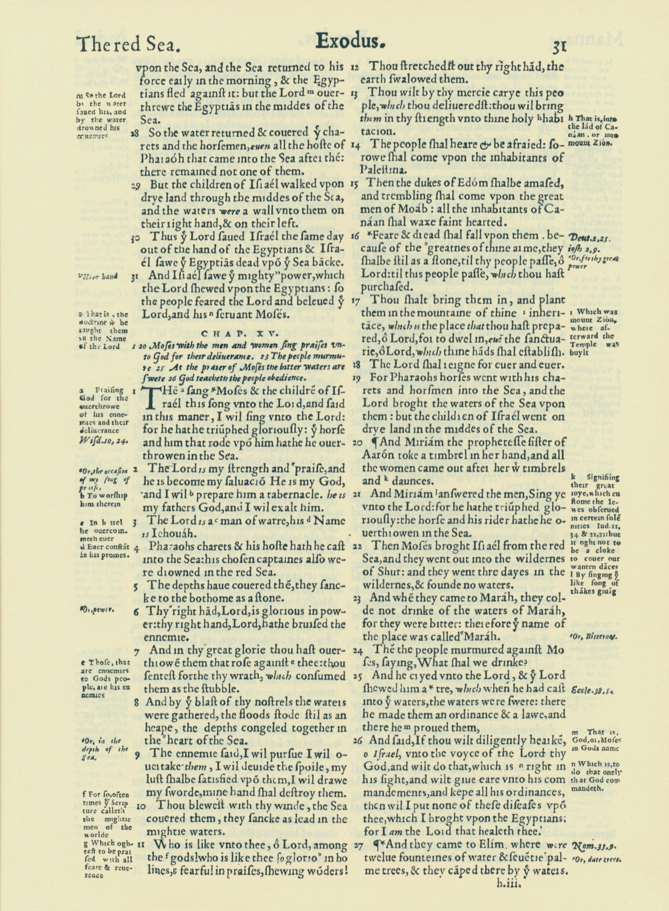 1560年THE BIBLE AND HOLY SCRIPTURES 出埃及記 14 章 28 節到 15 章 27 節