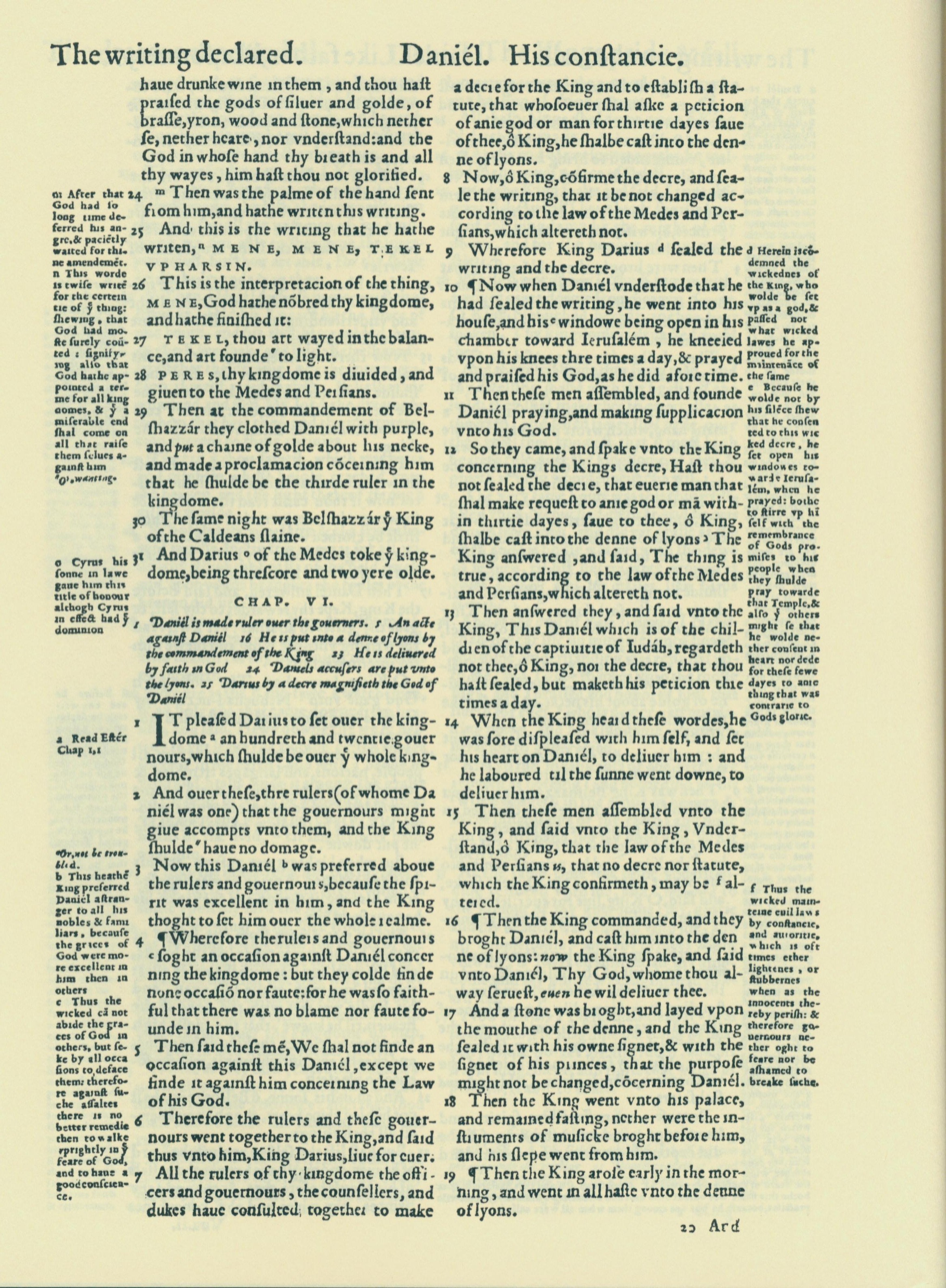 1560年THE BIBLE AND HOLY SCRIPTURES 但以理書 5 章 24 節到 6 章 19 節