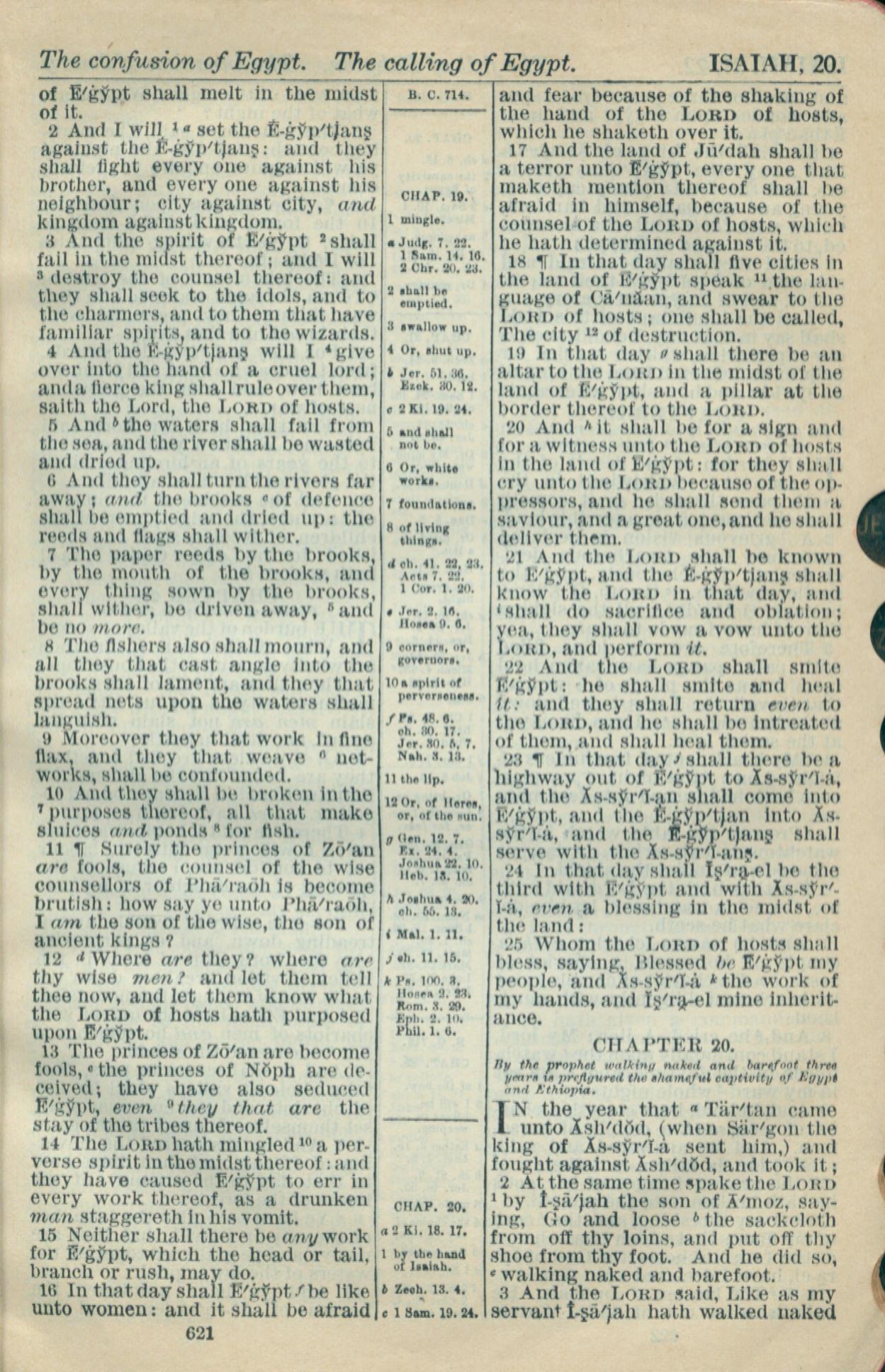 1916年Holy Bible 以賽亞書 19 章 2 節到 20 章 3 節