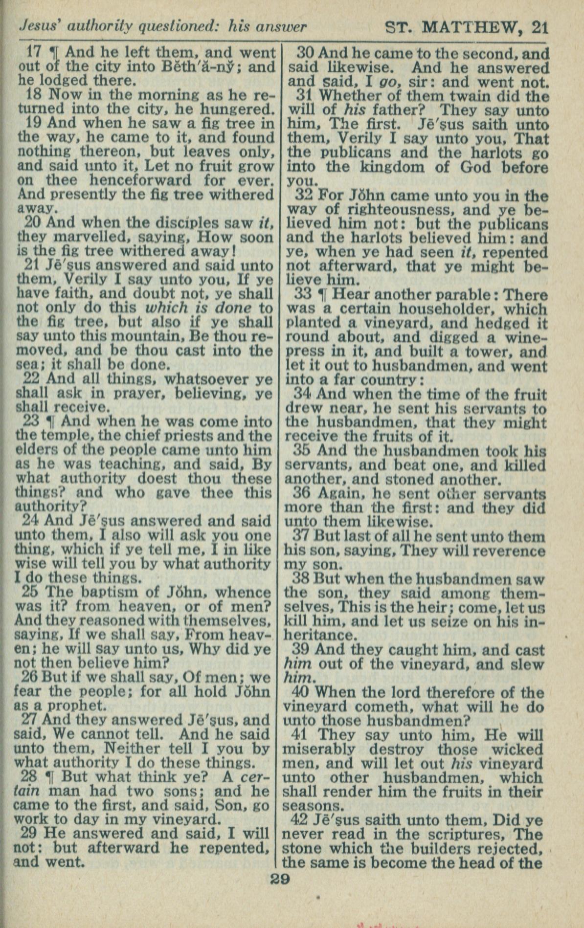 1946年King James Version 馬太福音 21 章 17 節到 21 章 42 節