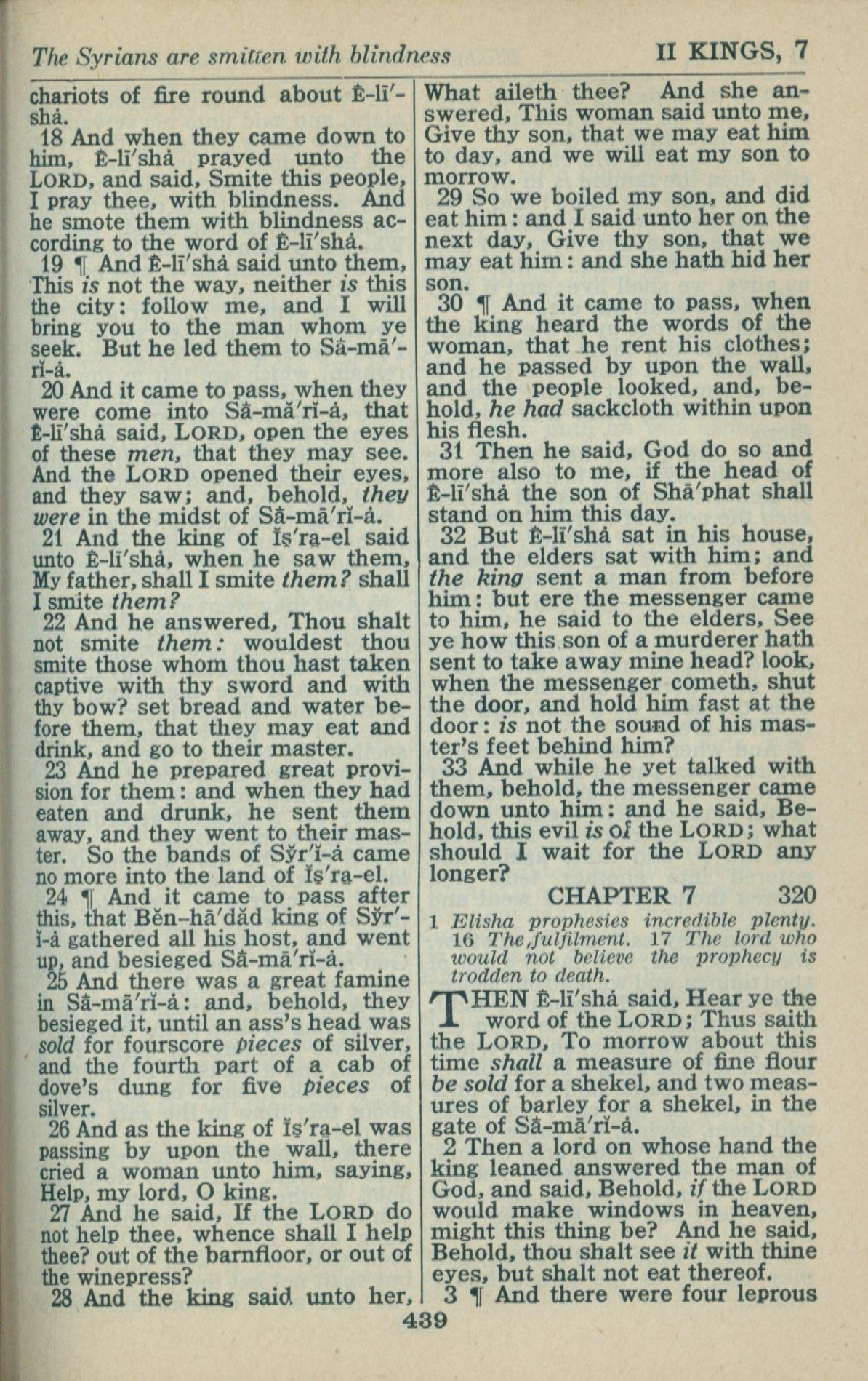 1946年King James Version 列王紀下 6 章 18 節到 7 章 3 節