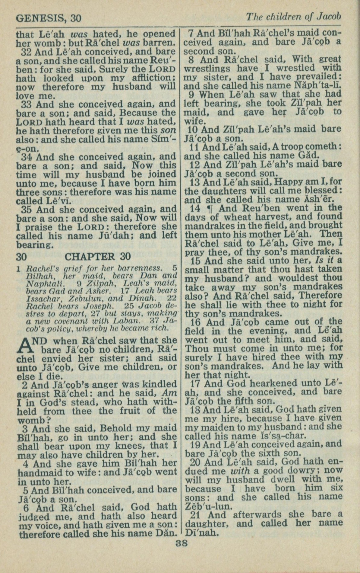 1946年King James Version 創世記 29 章 32 節到 30 章 21 節