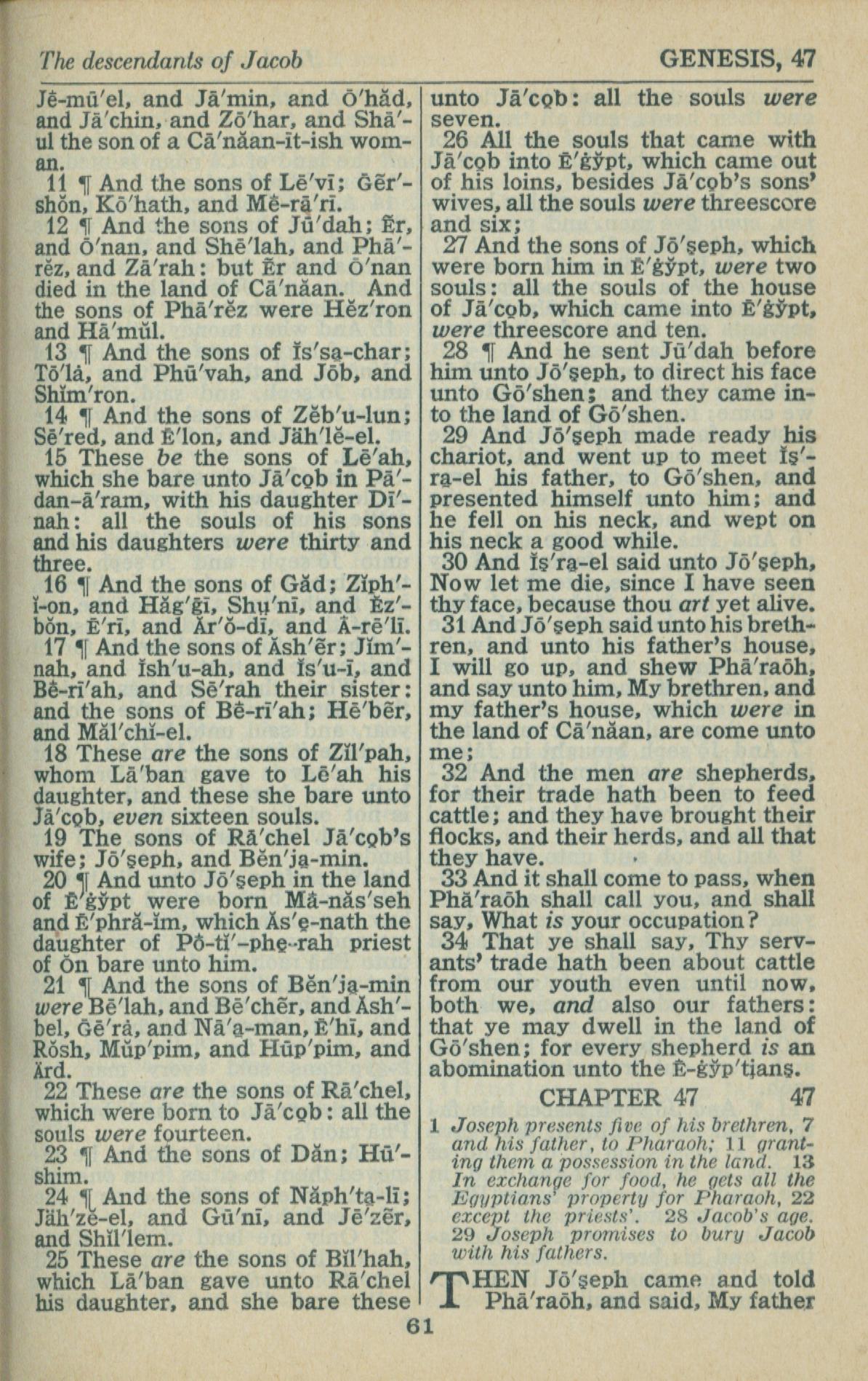 1946年King James Version 創世記 46 章 11 節到 47 章 1 節