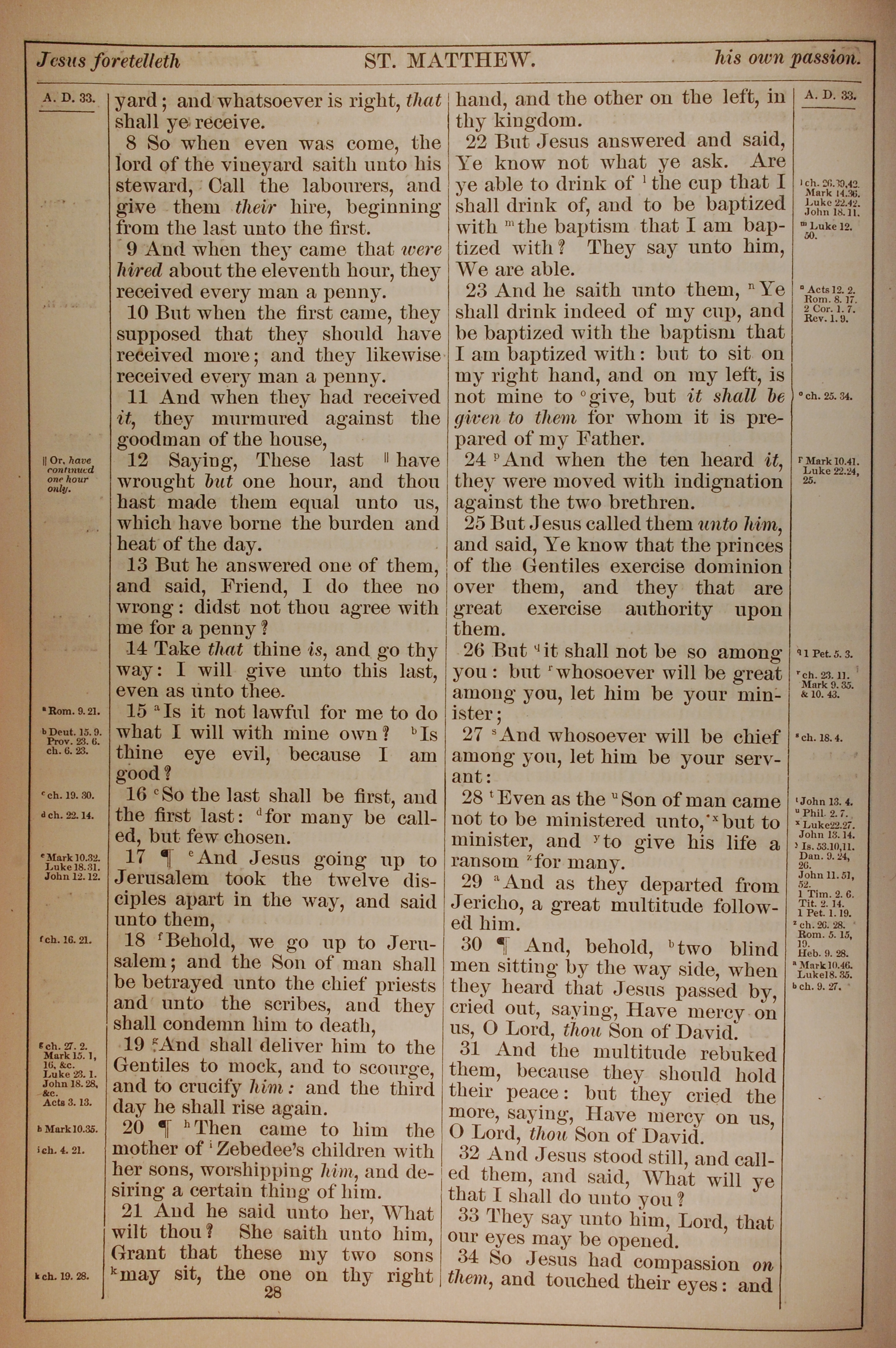 1882年Holy Bible 馬太福音 20 章 8 節到 20 章 34 節