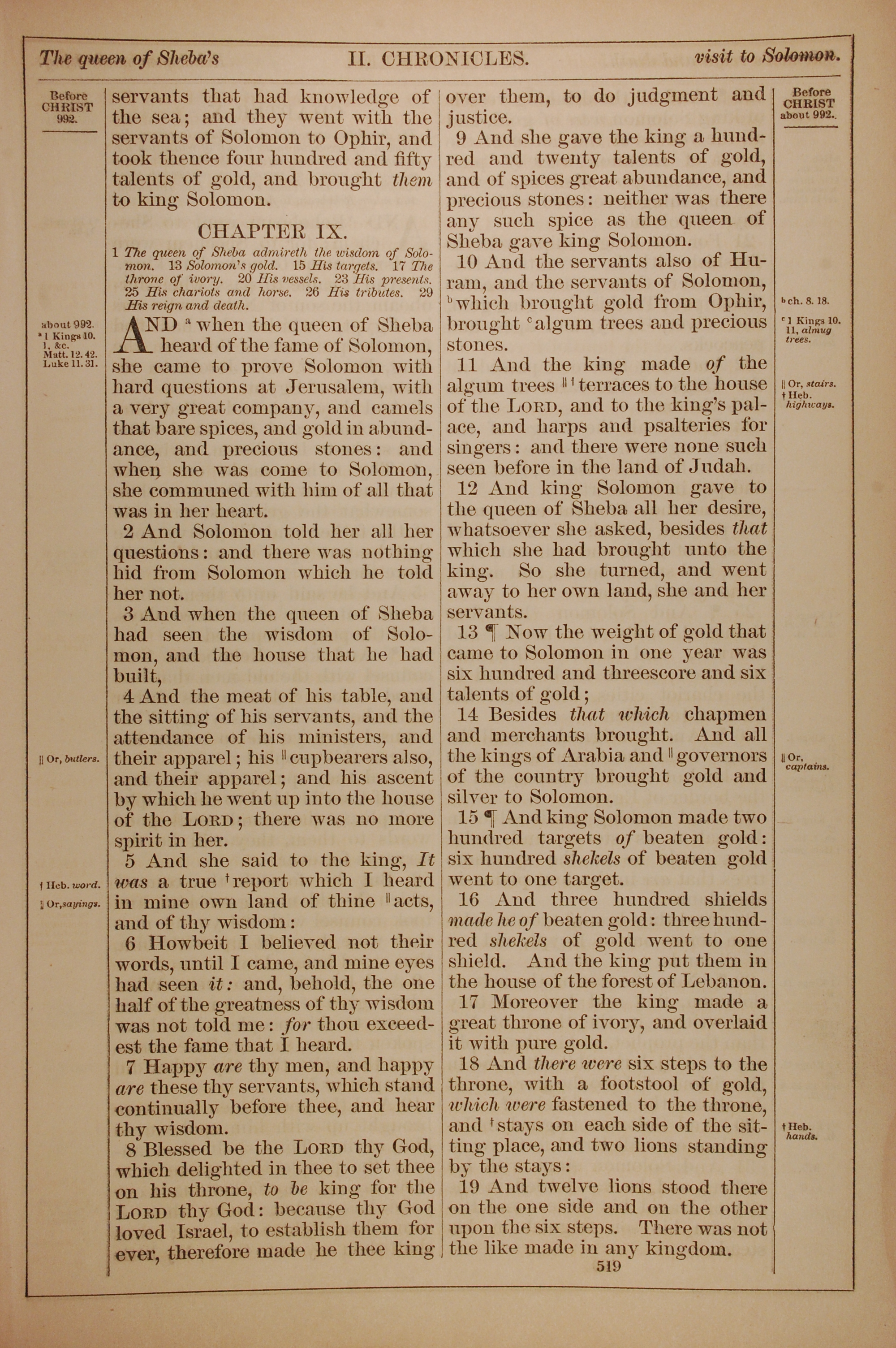 1882年Holy Bible 歷代志下 9 章 1 節到 9 章 19 節