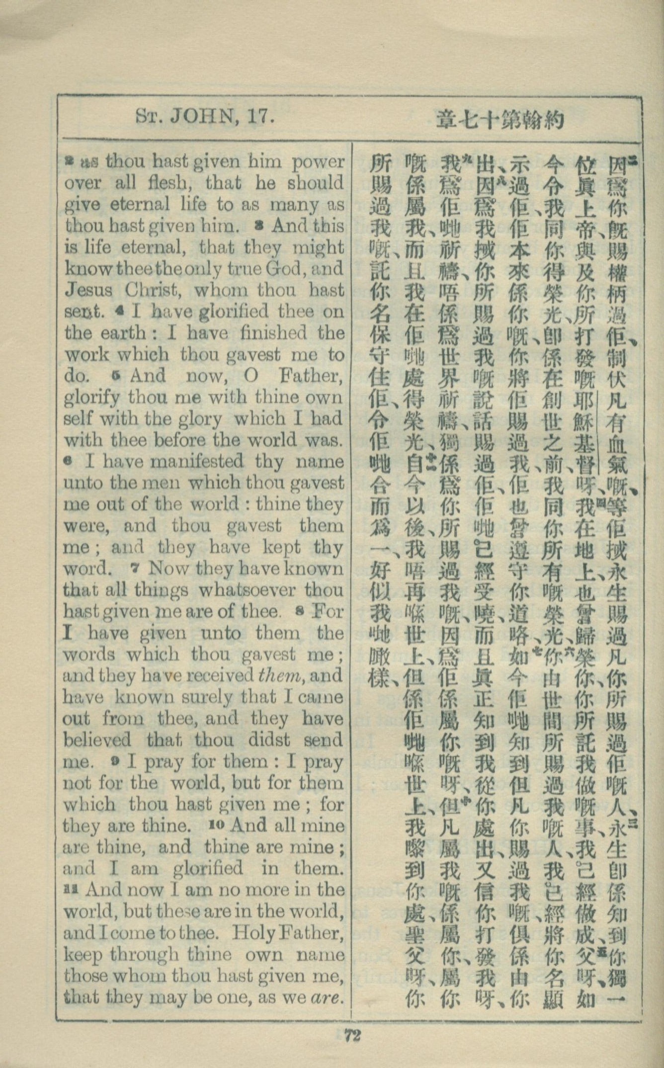 1927年約翰福音中西字 約翰福音 17 章 2 節到 17 章 11 節