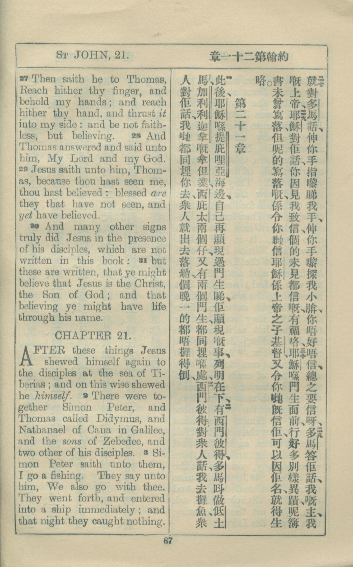1927年約翰福音中西字 約翰福音 20 章 27 節到 21 章 3 節