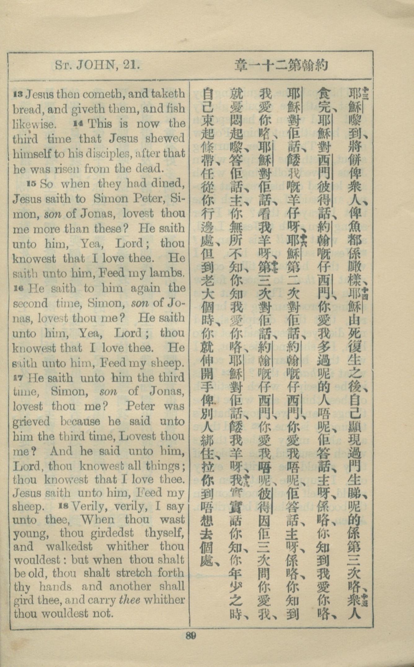 1927年約翰福音中西字 約翰福音 21 章 13 節到 21 章 18 節