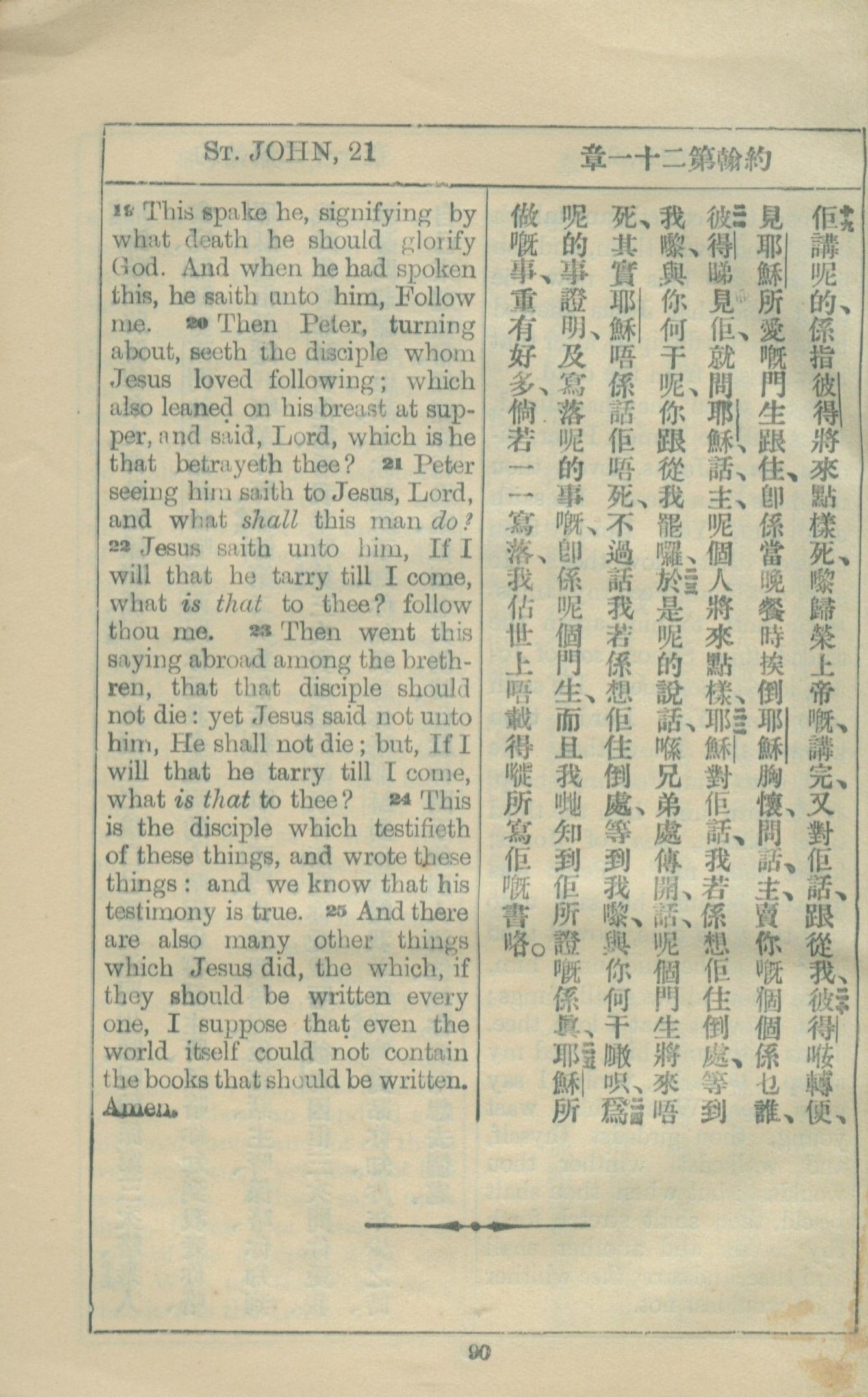 1927年約翰福音中西字 約翰福音 21 章 19 節到 21 章 25 節