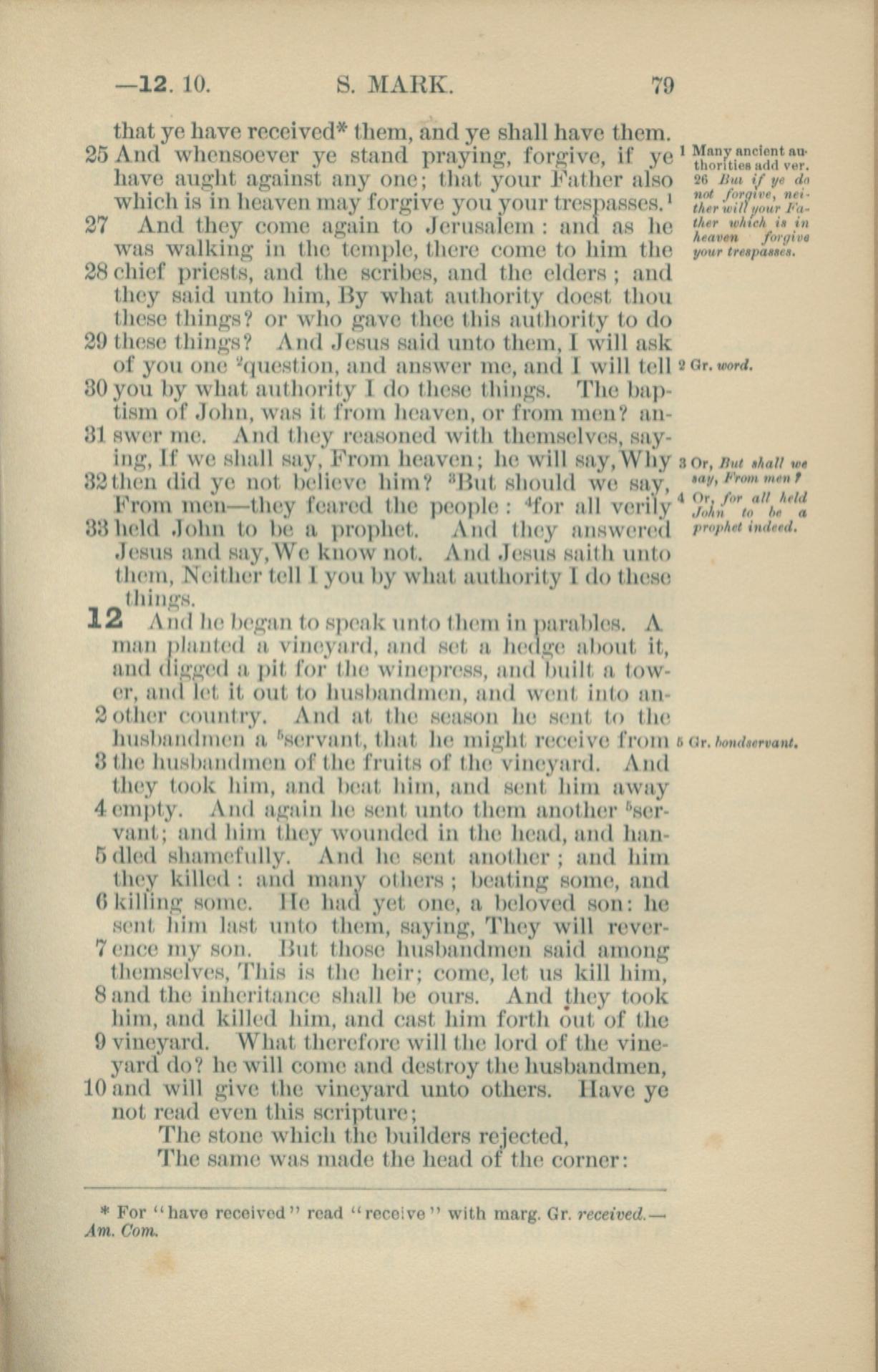 1881年New Testament 馬可福音 11 章 25 節到 12 章 10 節