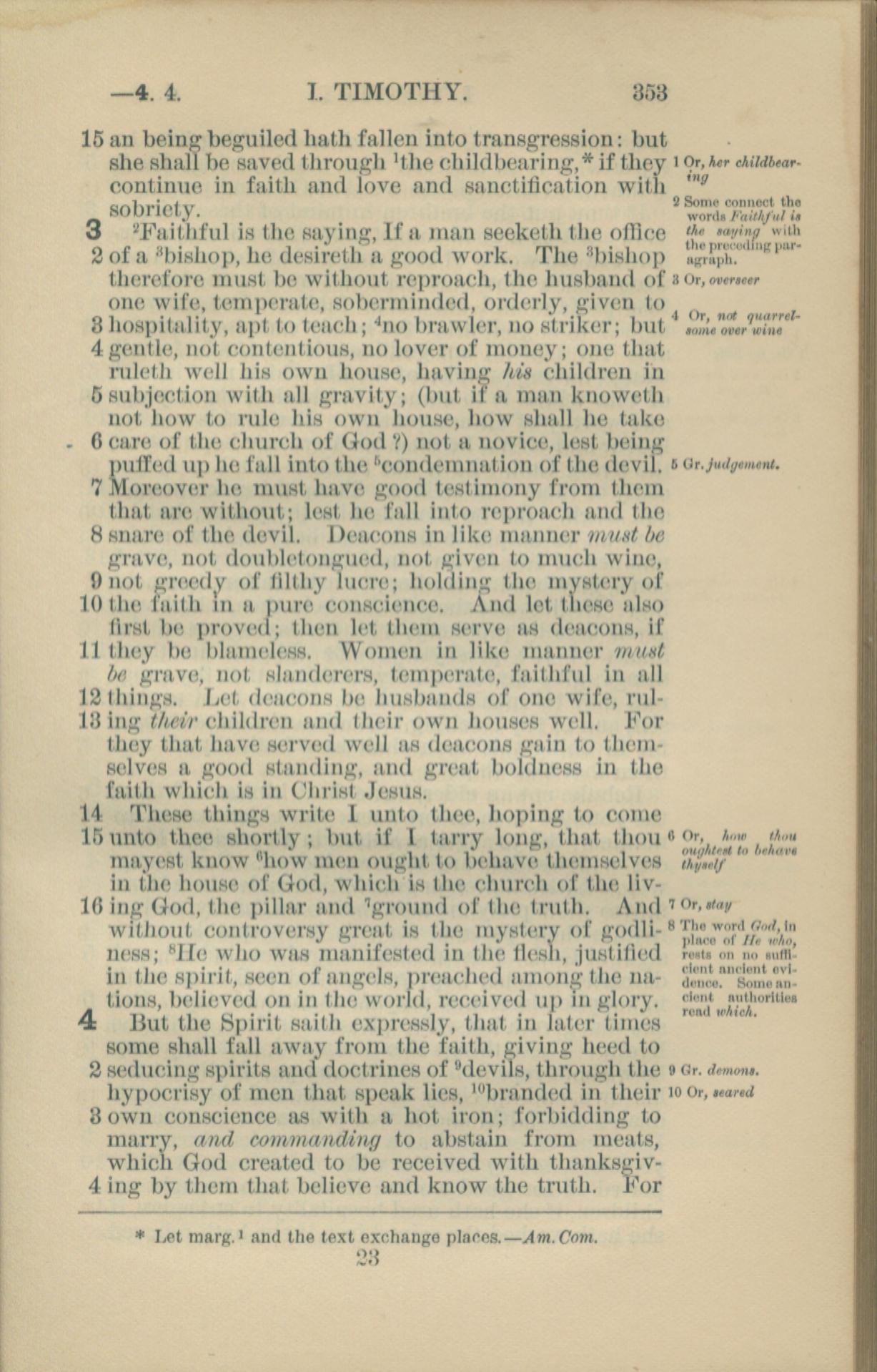 1881年New Testament 提摩太前書 2 章 15 節到 4 章 4 節
