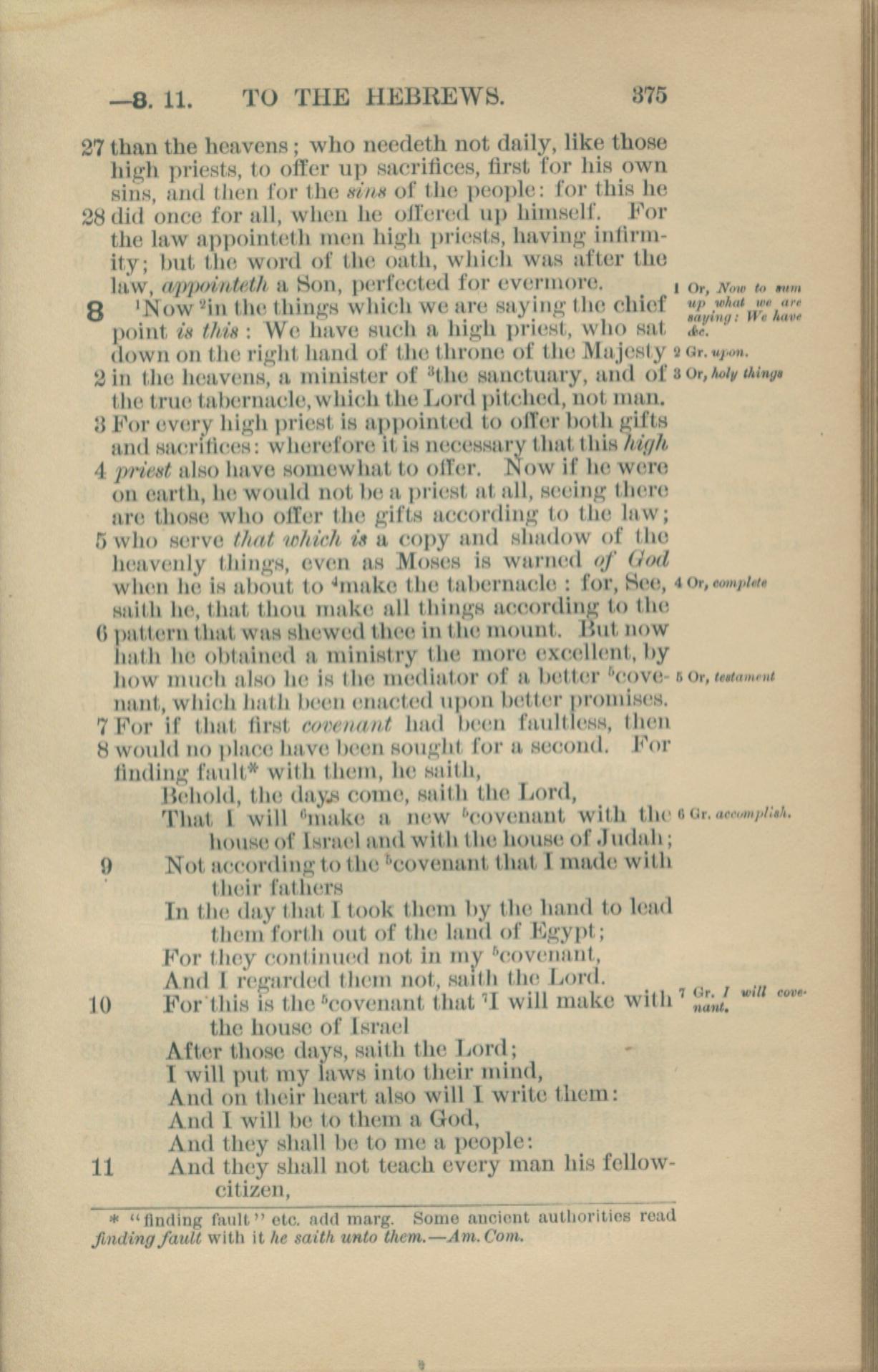 1881年New Testament 希伯來書 7 章 27 節到 8 章 11 節