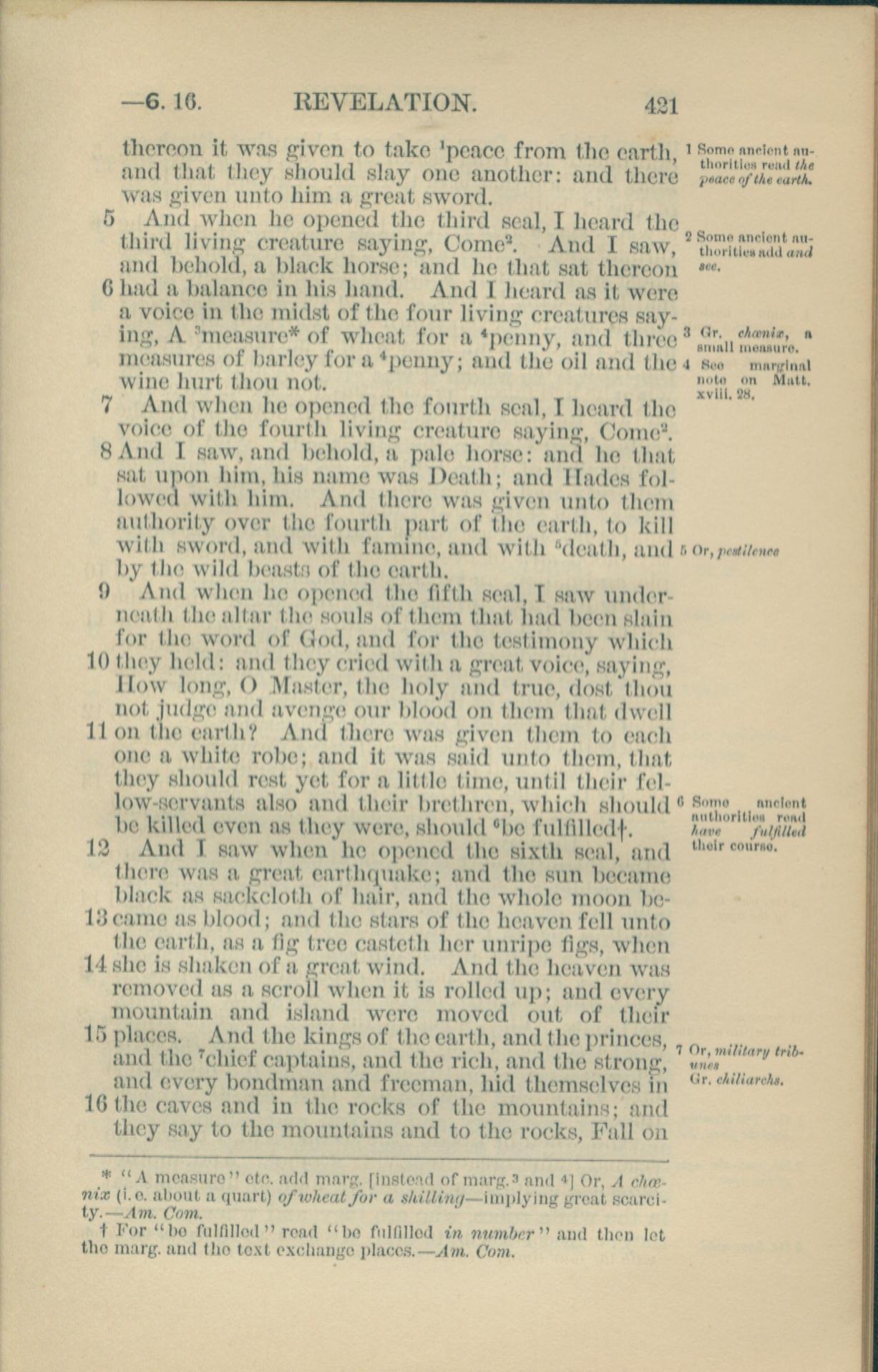 1881年New Testament 啟示錄 6 章 5 節到 6 章 16 節