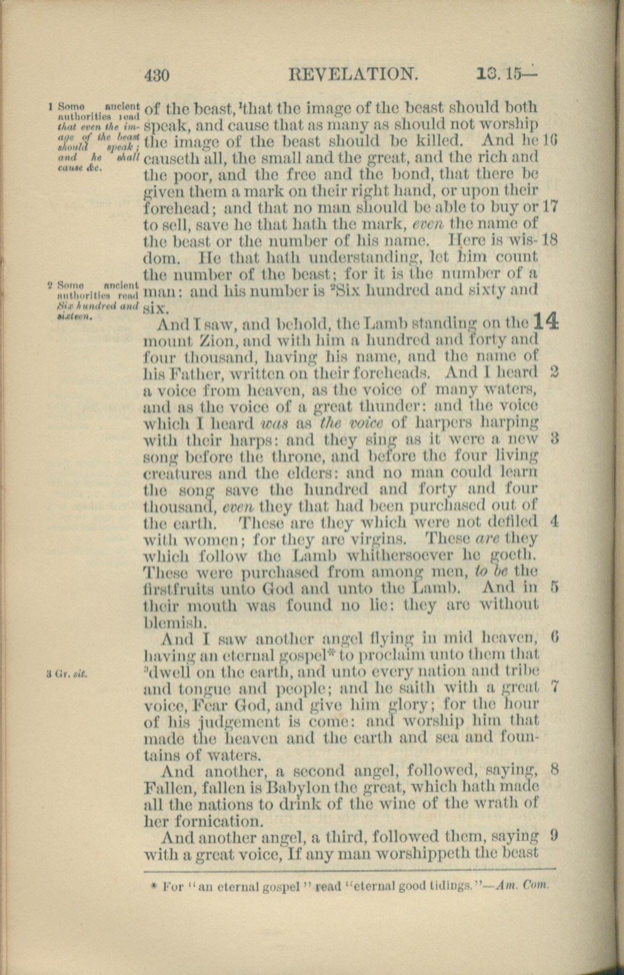 1881年New Testament 啟示錄 13 章 16 節到 14 章 9 節
