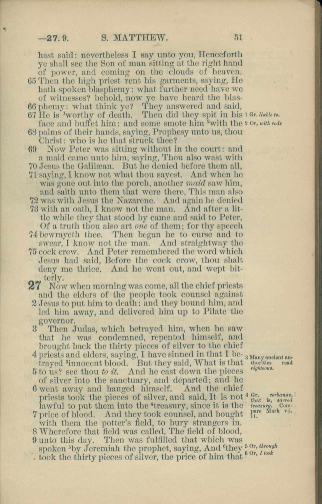 1881年New Testament 馬太福音 26 章 65 節到 27 章 9 節