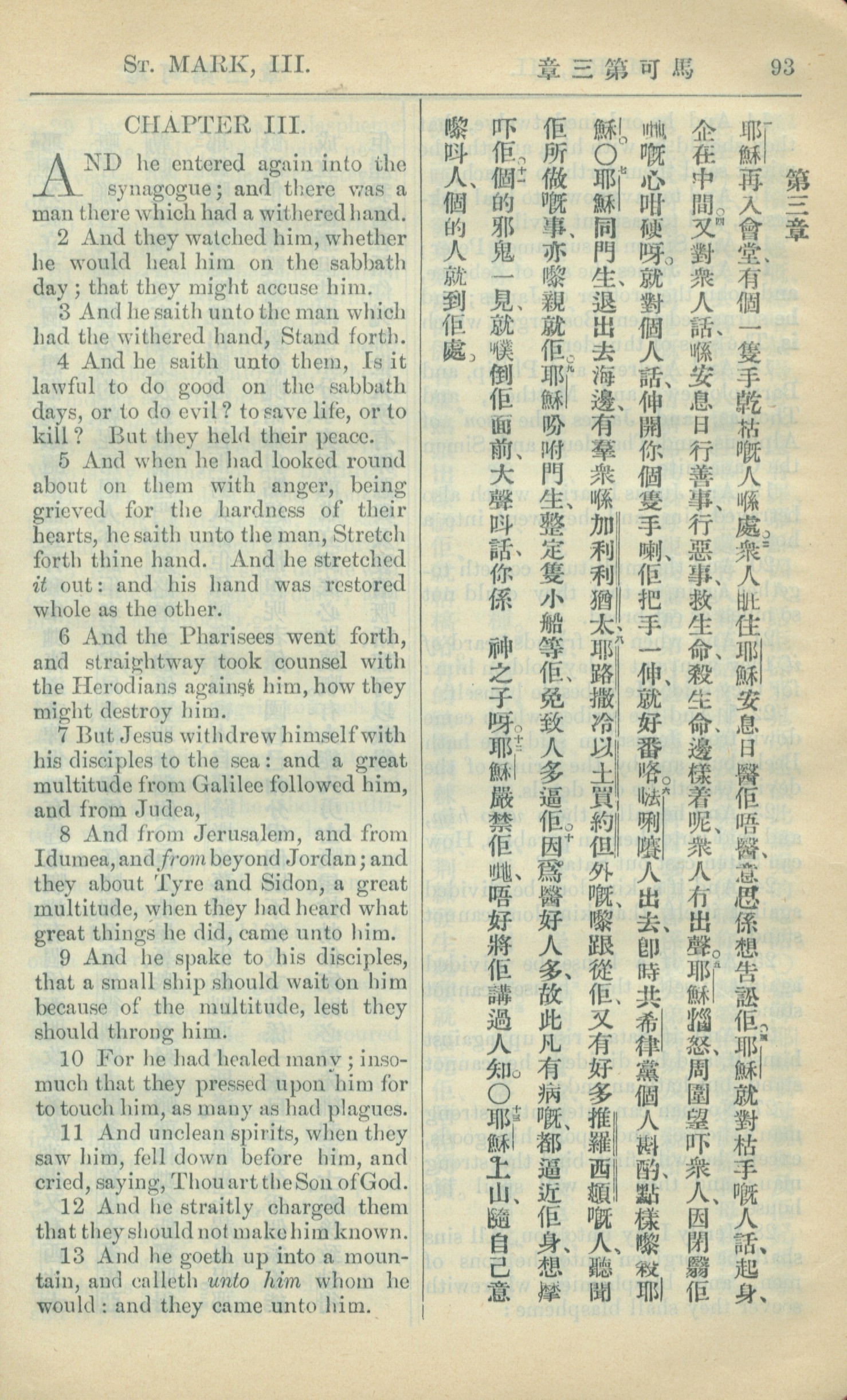 1909年中西字新約全書 馬可福音 3 章 1 節到 3 章 13 節