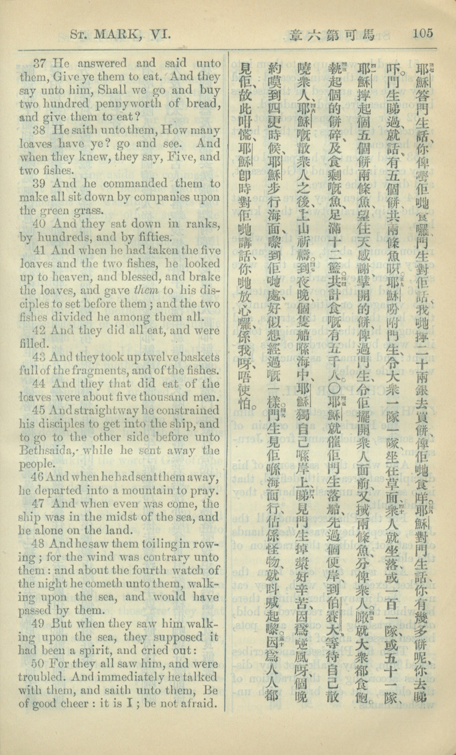 1909年中西字新約全書 馬可福音 6 章 37 節到 6 章 50 節