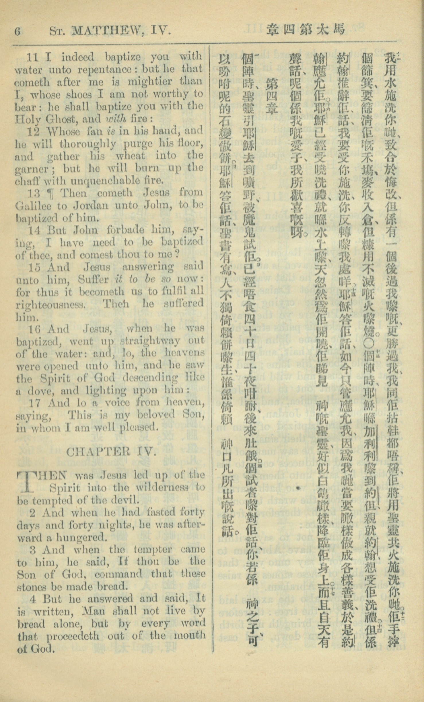 1909年中西字新約全書 馬太福音 3 章 11 節到 4 章 4 節