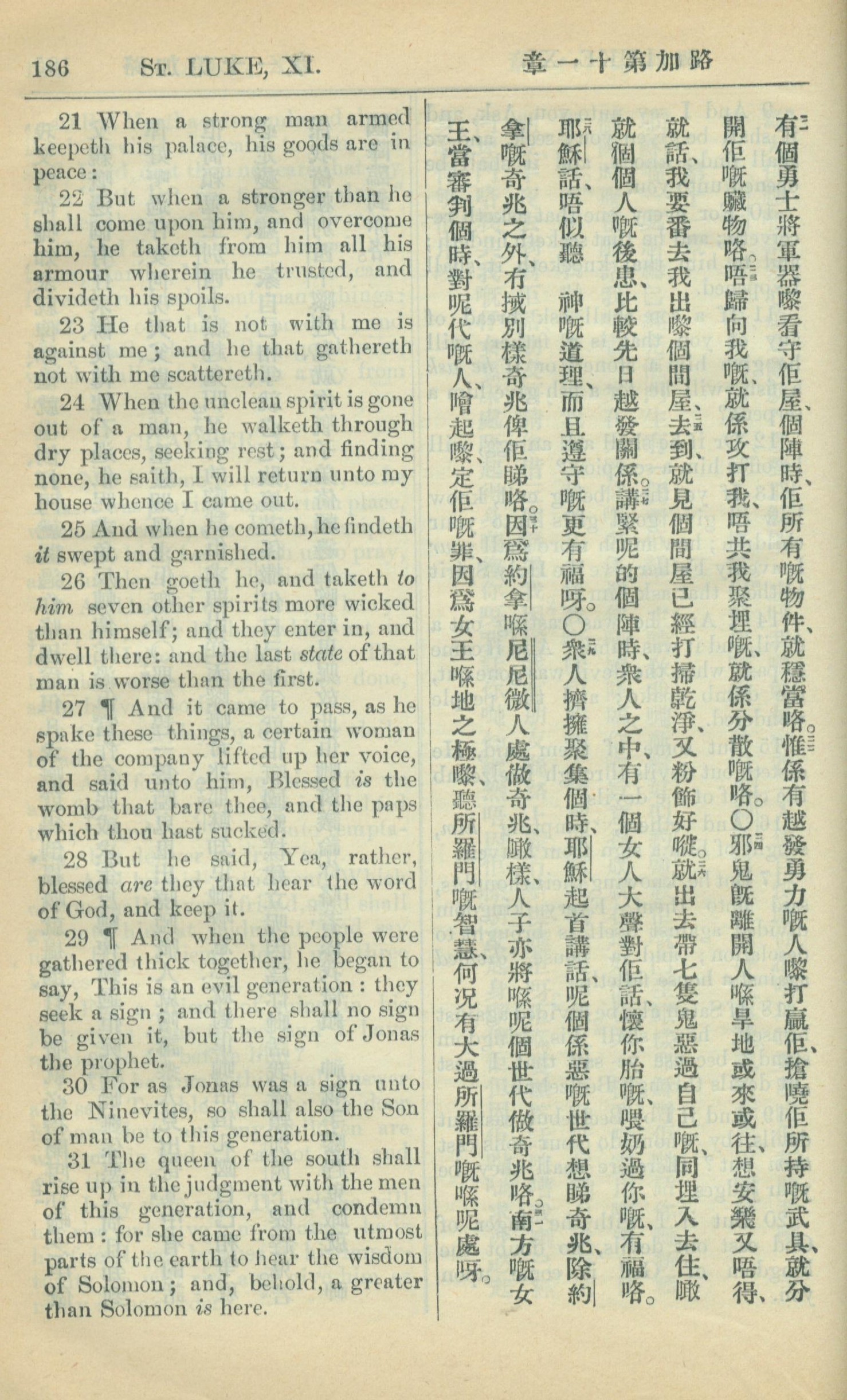 1909年中西字新約全書 路加福音 11 章 21 節到 11 章 31 節