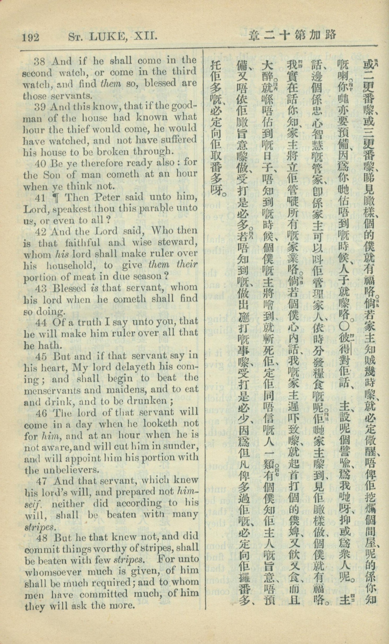 1909年中西字新約全書 路加福音 12 章 38 節到 12 章 48 節